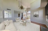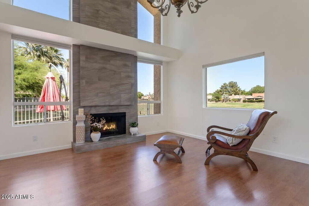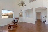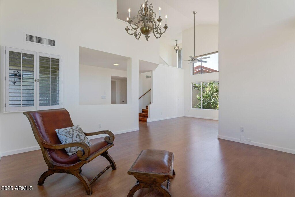 Beautiful airy architecture and expansive lush green golf course and distant mountain views. Dramatic slate fireplace soars to 2-story height with vaulted ceilings and windows surrounding the room to the views. French doors lead to the brick patio and long fairway vistas. A community pool is just steps away from the patio gate. Clean,hard-surface flooring with laminate wood and tile. Updated kitchen and baths (downstairs powder) with newer appliances. A spacious primary enjoys a luxurious bath and dual closets. Idyllic location on a cul-de-sac with views wrapping the back and side yards,offering privacy. Juliet balcony off secondary bedroom. Walkability to the PV mall and entertainment venues,bike or walk the greenbelt pathways or hike the nearby preserve. Garage insulated and cooled.