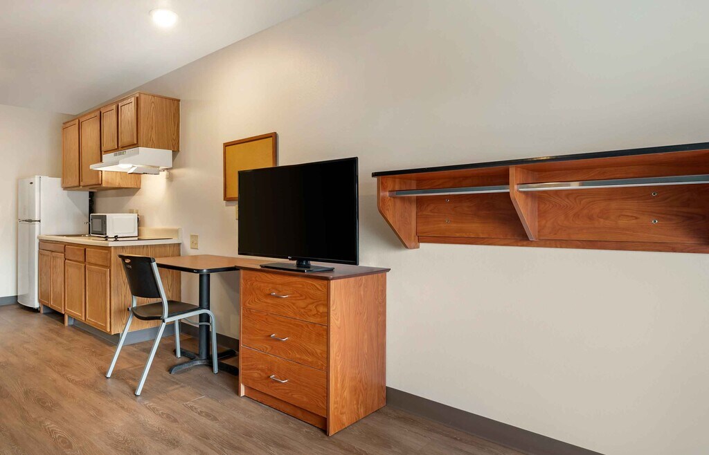 Enjoy a fully furnished studio suite in our hotel at an affordable rate with free wi-fi, free utilities and free premium cable. Each studio suite has a full kitchen with full-size refrigerator, stovetop and microwave, and has a flexible workspace and plenty of storage. All our hotels are pet-friendly and have on-site guest laundry available. Plus, there are no long-term commitments and you can adjust your length of stay to meet your individual needs, subject to applicable property and/or local restrictions. Additional fees may apply. Booking restrictions and taxes apply. Rates and availability are subject to change without notice.