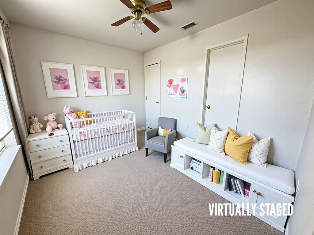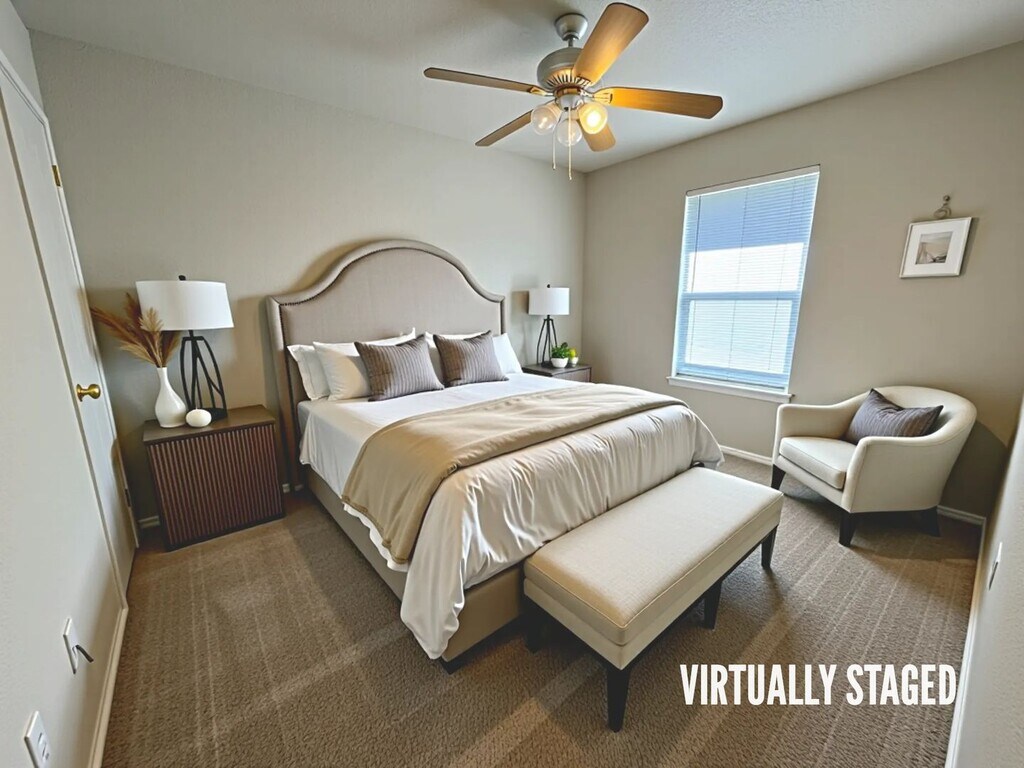 View 360 Virtual Tour: 2-bedroom 1-bath apartment featuring a breakfast bar, carpet and vinyl flooring, and all white appliances. The bathroom includes a soaker tub, and a covered balcony provides a comfortable outdoor space to relax. Come by our office to see this apartment today. Disclaimer: The furnishings or enhancements shown are AI-generated and intended for inspiration only. They may not reflect the actual scale, condition, or current features of the property.