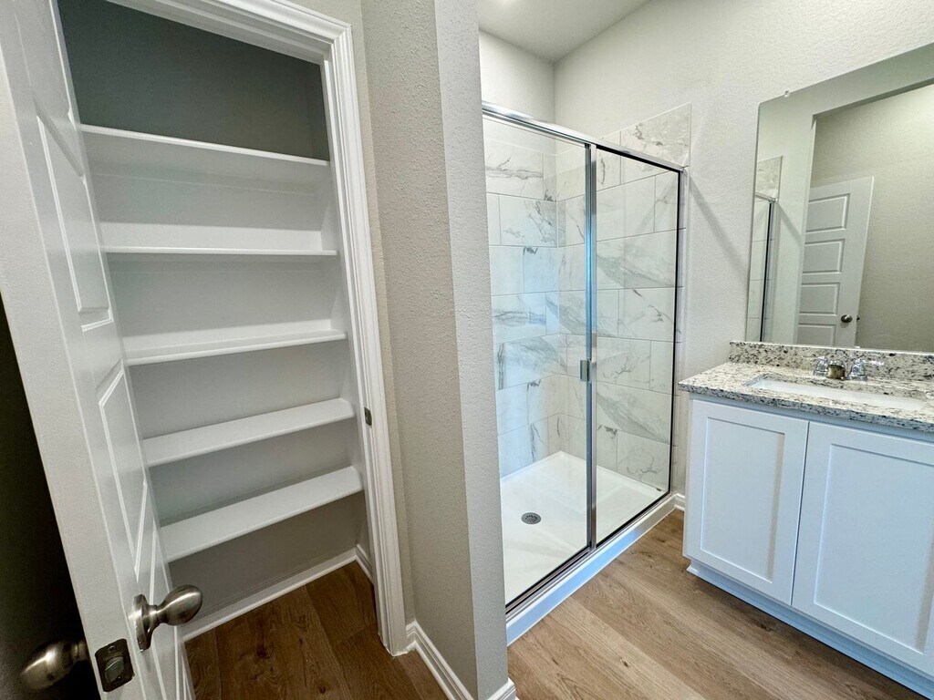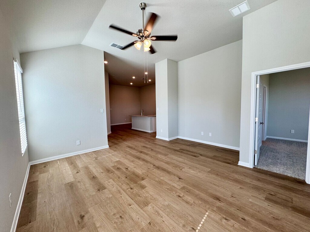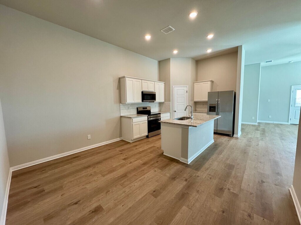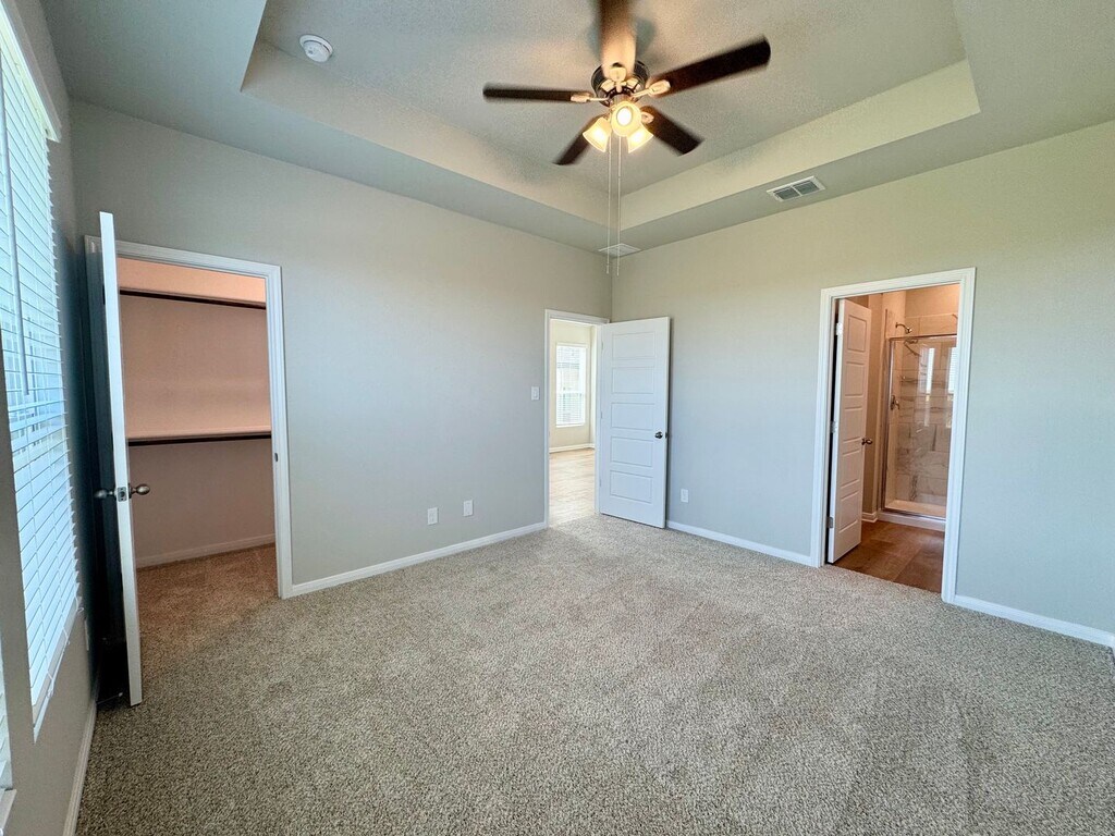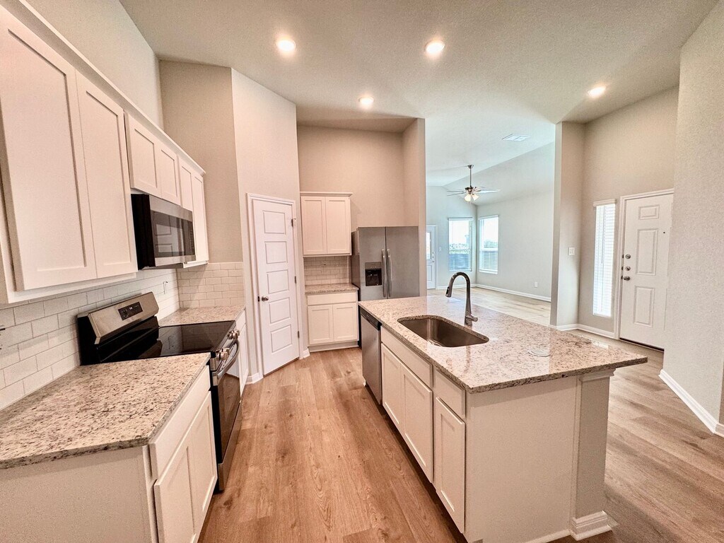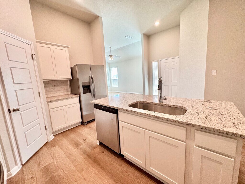 This beautifully designed 3-bedroom, 2-bathroom duplex features just over 1300 sq. ft. of ample living space, boasting an open-concept layout, hardwood laminate flooring, and soaring 11-foot ceilings. Large windows throughout provide excellent natural light in every room. A stunning chefs kitchen includes; stainless steel appliances, granite counter tops, large kitchen island, stylish tile backsplash, and sleek white cabinetry. The spacious primary bedroom, located on opposite end of the home from the secondary bedrooms, features an ensuite bathroom including granite counter-tops, double vanity, generous cabinet storage, and a luxurious walk-in shower. The expansive walk-in closet is sure to impress, offering more than enough space for all your needs. Just off the garage, you’ll find a practical and stylish drop zone—perfect for organizing your daily essentials. Every inch of this home is designed with functionality in mind and smart storage solutions throughout. Start and finish your day on the private patio looking out to a spacious, fully fenced backyard. Perfect for enjoying the breathtaking open skyline. Located just 15 minutes south of downtown Austin via I-35, this prime location also offers easy access to Kyle, San Marcos, and New Braunfels. Don't miss this opportunity to experience living the perfect blend of style, comfort, and convenience at Emma Park!