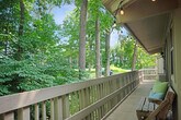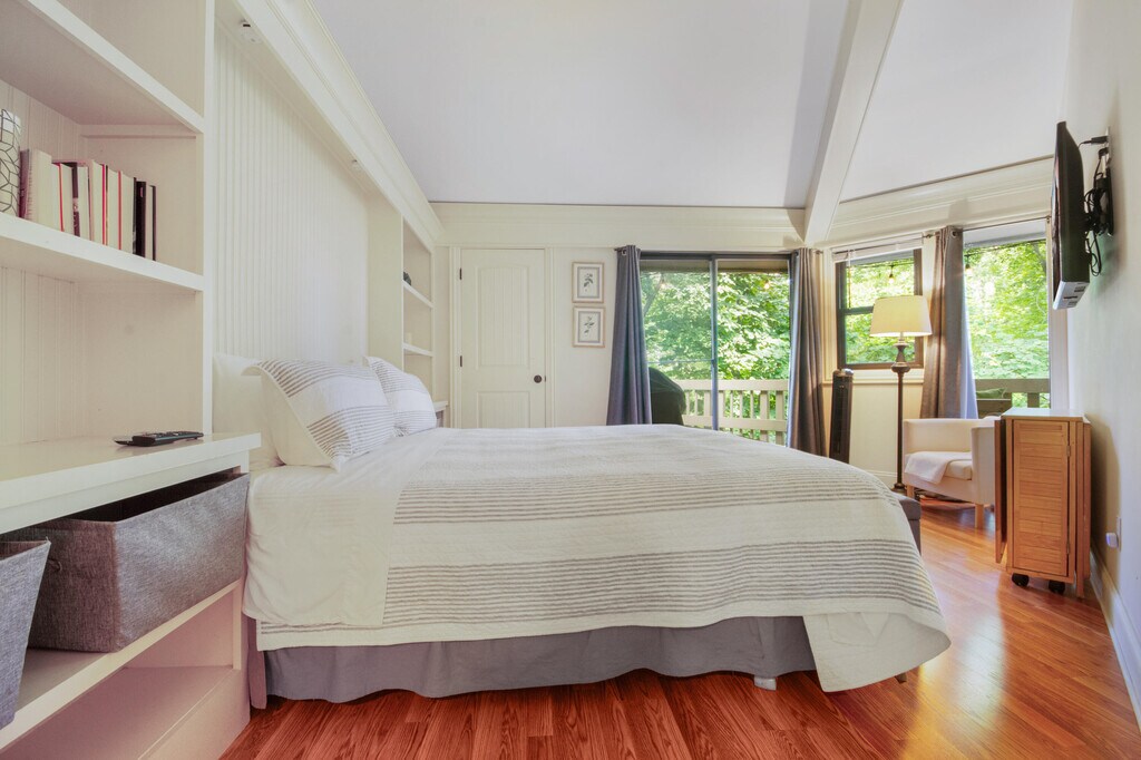 2 bed,1 bath 'Holiday' model in Abbey Springs,set in a wooded 2nd-floor location and ready for summer fun! Vaulted great room opens to kitchen with 5-seat breakfast bar,maple cabinets,granite tops & SS appliances. Hardwood floors,custom trim,and woodwork throughout. French doors lead to primary bedroom with king bed,built-ins,balcony access & en suite with separate tub/toilet area. 2nd bedroom has full-size bunk beds and walk-in closet with dryer.