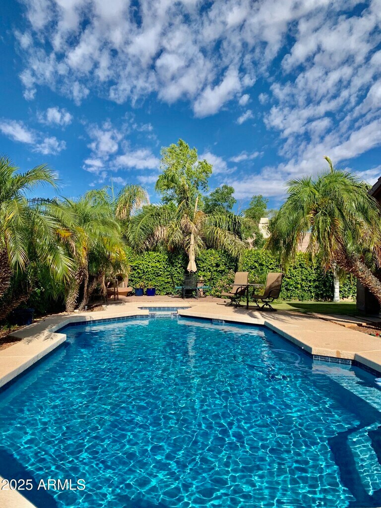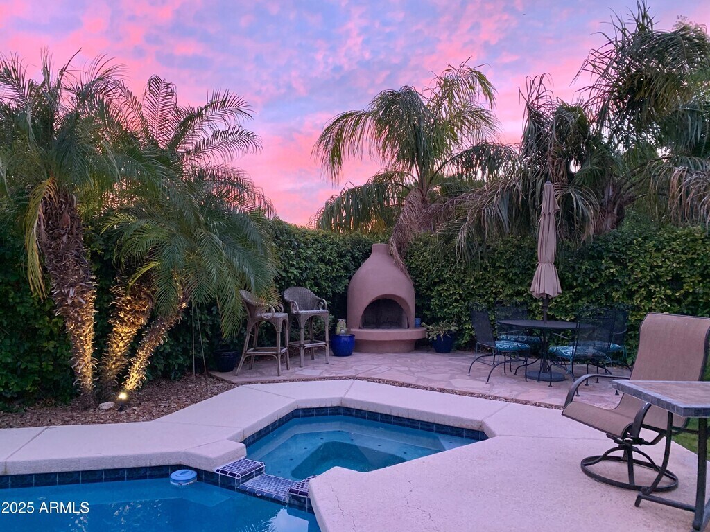Beautiful 3-bed,2-bath home in Stetson Hills on a quiet cul-de-sac with stunning mountain views,breathtaking sunsets,moonrise over the mountain,and grass in the front and backyard. Enjoy a resort-style backyard with a pool,spa,covered patio,and greenery adorning all sides of the privacy walls. Positioned for total seclusion-no neighboring windows or public view. Perfect for relaxing or entertaining. Walk to top-rated schools,parks,hiking trails. Close to shopping,restaurants,entertainment,golf,ball fields,hospitals,and medical facilities. Home features an open great room,vaulted ceilings,skylights,and a bright kitchen with breakfast bar. The split floor plan offers privacy,and the spacious primary suite includes a walk-in closet and dual vanities. Move-in ready
