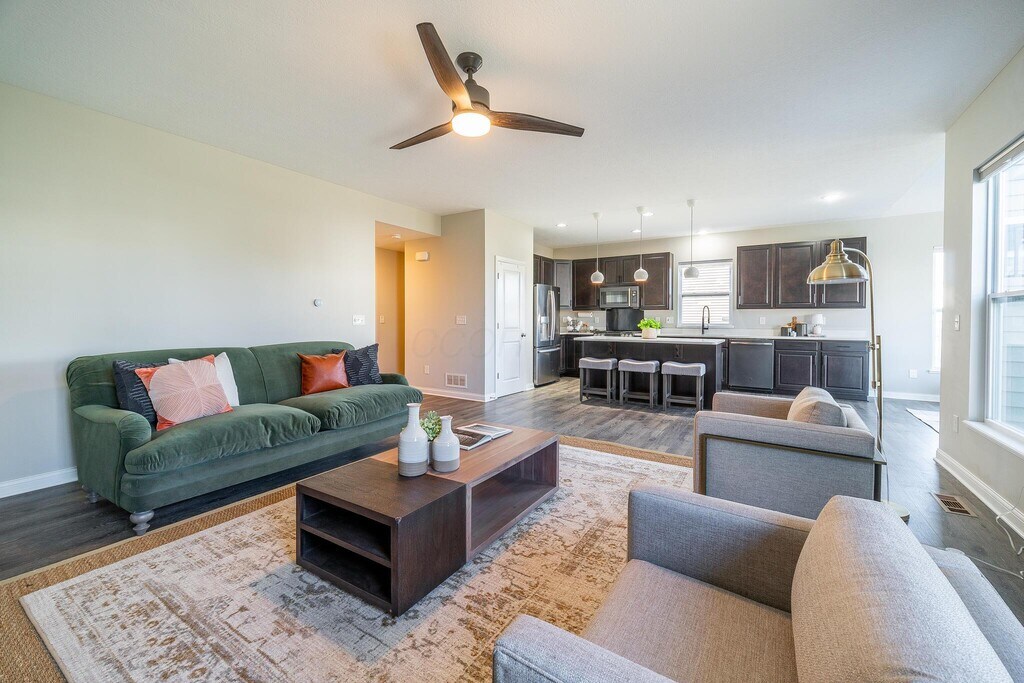 Now available in Powell: a modern farmhouse-style home with a rare 5-bedroom layout in the highly-rated Olentangy School District. Built in 2018,this modern farmhouse-style home offers a clean,updated feel and a contemporary layout designed for comfortable living. The open-concept main level features a cozy decorative fireplace,stainless steel appliances,and a seamless flow between the kitchen,dining,and living areas. First floor dedicated office offers a bright and private workspace. Step outside to enjoy an expanded deck and spacious grassy yard—great for entertaining or relaxing outdoors. Upstairs,you'll find a laundry room with washer and dryer included,along with five bedrooms offering flexible space for rest,work,or hobbies. A large unfinished basement provides ample storage or room for a home gym or workshop. The two-car garage includes an EV charger for electric vehicle convenience. This is a rare leasing opportunity in a high-demand Powell neighborhood,offering the space and features typically found in owner-occupied homes. Landlord prefers multi-year tenants looking for long-term stability,and listed rental price reflects the cost for the first year. Pet fees determined on a case-by-case basis. Available for immediate occupancy.