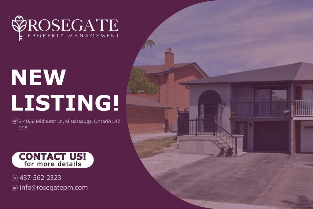 Bright 1-Bedroom Walk-Out Basement with Free Internet & Parking in Mississauga Welcome to 2–4039 Midhurst Ln, Mississauga — a bright and well-maintained 1-bedroom, 1-bathroom walk-out basement apartment offering approximately 650 sq. ft. of comfortable living space in a quiet, family-friendly neighbourhood. Ideal for professionals or couples, this home provides great value within a professionally managed Ontario rental property.The unit features a spacious bedroom, a modern bathroom, and an open-concept living area that welcomes plenty of natural light through its walk-out design. The layout maximizes both comfort and functionality, creating a warm and inviting environment for everyday living.Added conveniences include free internet access and one dedicated parking space, making this unit an ideal choice for those who value both comfort and connectivity. The walk-out setup enhances ventilation and natural brightness, offering a more open and airy feel than typical basement units.Professionally managed by Rosegate Property Management, a trusted Ontario rental property management company, this Mississauga basement apartment for rent is close to parks, schools, shopping, and transit. A bright, modern, and convenient home — schedule your viewing today and experience quality Ontario rental living.