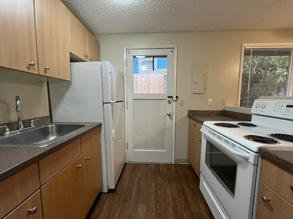 Welcome to this charming 2-bedroom, 1-bathroom home offering 888 sq. ft. of comfortable and efficient living space. A large front tree and inviting front patio create great curb appeal and a welcoming first impression. Step inside to an open, carpeted living room filled with natural light from a long picture window stretching across the wall. Just off the living room, the dining area and kitchen feature easy-care wood vinyl flooring, creating a seamless flow between spaces. The kitchen offers light wood cabinetry, white appliances including an electric stovetop/oven and refrigerator, a deep stainless steel sink, and a full-size washer and dryer. With ample countertop space and plentiful storage, this kitchen is both practical and functional. The first bedroom is impressively spacious, featuring two large windows—one tall and one long—that brighten the room throughout the day. A long closet with sliding doors provides excellent storage. The second bedroom is also generously sized with a long window, soft carpeting, and a step-in closet. A full bathroom sits conveniently between both bedrooms and includes a long single-sink vanity, matching extended mirror, and a tub/shower combo. This cozy home offers a smart layout, abundant natural light, and well-sized bedrooms, making it an inviting place to call home. **Open Application Period begins (11/14/25)** Call or Text Our Leasing Agent at to schedule a showing! YouTube Video URL: Coming Soon Visit our website to apply and view other homes we have available! Do you need property management services? Maximize your income and cut your costs!