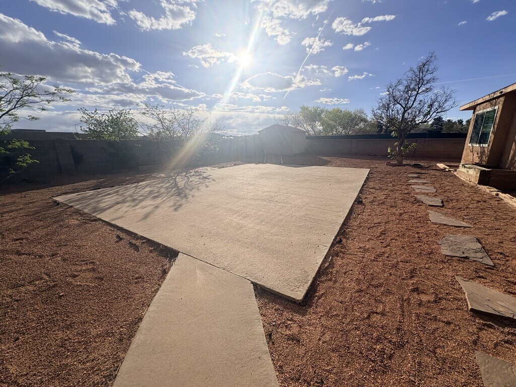 Electricity included! Enjoy stress-free living in this beautifully maintained 3-bedroom, 2-bath home in the desirable Enchanted Hills area, set on a huge lot with plenty of space inside and out. The open floor plan features no carpet throughout for a clean, modern feel and easy upkeep. The eat-in kitchen comes fully equipped with all appliances, including a washer and dryer. Designed for entertaining, the spacious layout offers great flow and natural light, plus refrigerated air for year-round comfort. The backyard includes two storage sheds, adding extra convenience to this already well-appointed home.