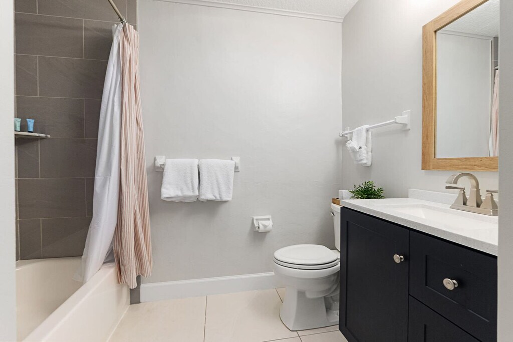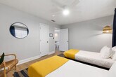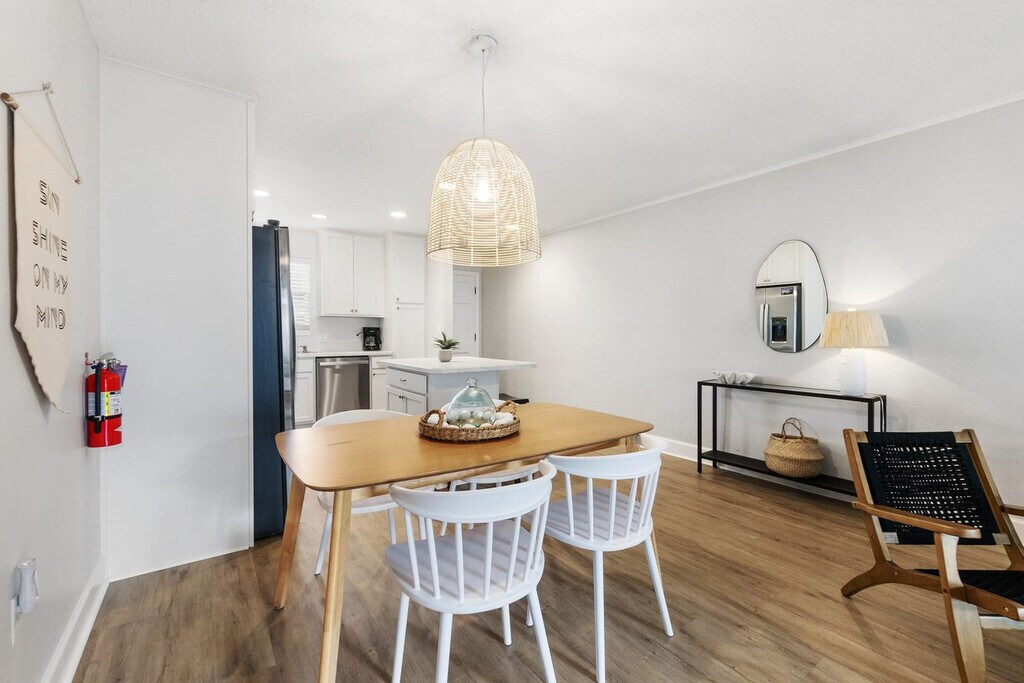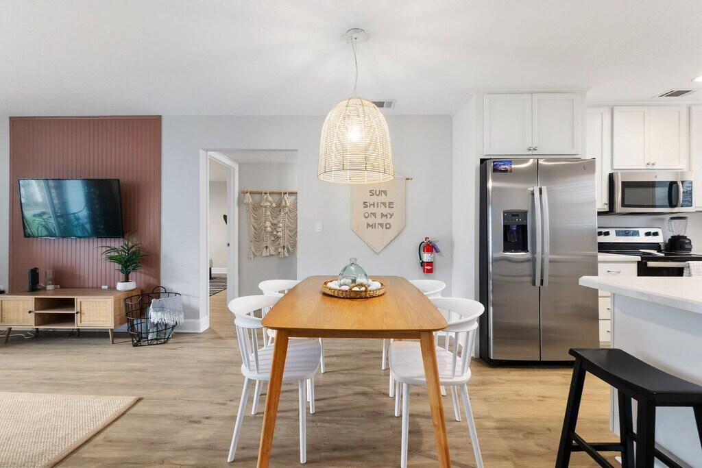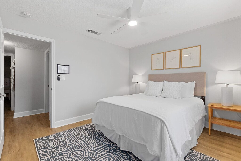 Feel at home in this spacious and modern condo, perfectly located between downtown and the beach. This 2-bedroom condo offers bright, beachy vibes throughout. This beautiful condo is fully equipped and includes a full kitchen, 1 full bathroom with a shower/tub combo, a living room with cozy seating and a flat-screen TV, 1 master bedroom, and 1 additional bedroom. Spacious bedroom closets have hanging shelves and hangers. Beach gear, including chairs, towels, toys, and a cooler, is provided. Relax inside with local channels and Netflix available on the flat-screen TV and family games stocked in the living room. Enjoy your morning coffee or evening drink on the private back porch with seating. This condo is stocked with all the essentials. Two assigned parking spots are included with your stay, one of which is covered. The condo is located perfectly in town, just a 15-20 minute walk into the downtown district and only a couple of miles away from the nearest public beach. It's less than a 10-minute drive to the beach and a 10-15 minute drive to the public beach. Walk to local favorites such as Old Coast Ales, Osprey Tacos, and Llama. Quiet hours are between 9:00 PM and 8:00 AM. The minimum age to book is 25, and the primary guest on the reservation must be present for the duration of the stay. If you have more guests on the premises than you have notated in your reservation, we reserve the right to charge an additional fee. This home is not suitable for parties, including bachelor/bachelorette parties, wedding parties, receptions, or any other large group gathering. Any guests visiting outside of the reservation must be approved prior to their arrival. Quiet hours are from 10 PM to 8 AM per St. Johns County ordinance and are enforced. In addition, any guests outside of the reservation must vacate the property during this time. The home has an actively recording security camera installed at the front door of the home. An attempt to remove, tamper, or disconnect the internet to Ring may result in the reservation being canceled and guests requested to vacate the premises. Do not move furniture, appliances, or décor from where you found it upon check-in. Outdoor furniture must be returned to its original positioning in which you found it upon check-in. No pets are allowed on the property at any time. Guests who stay past checkout time will be charged an additional fee of $50/hr. No vaping/smoking is allowed whatsoever on the property, including the front porch, and if evidence of smoking is found, you will be subject to an additional cleaning fee. Illegal drugs are strictly prohibited, including marijuana. Do not flush anything down the toilet except toilet paper. Renters are 100% liable for any and all property damage caused by themselves or guests during their stay. While we allow children, the home is not child-proofed, and parents with younger children use the home at their own risk. You are required to follow the House Rules written here and posted in the house during your stay or risk being removed from the property. Checkout procedures must be completed as written here and posted in the house, and any excessive mess will result in loss of security deposit in the additional amount that is needed to pay cleaners. [SI]