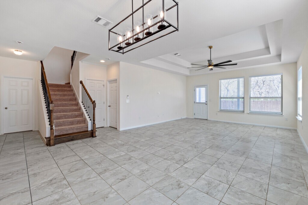 Absolutely beautiful 5 bed/ 3 full bath in highly coveted Larkspur that backs to a Greenbelt and is in walking distance to the elementary! This lovely home has an open floorplan and big picture windows making it a bright and happy home! The chefs kitchen is amazing with a huge center island, Quartz Counters, tile backsplash, stainless steel appliances, deep farm sink and sleek SS refrigerator! It features modern tile flooring downstairs, iron stair railings, double tray ceilings w oversized fans, 2 inch wood blinds & iron rods & curtains! The primary is downstairs along with another full bedroom and bath and there are an additional 3 bedrooms up plus a gameroom & media room that are the fun spaces for any family! The primary bath has a spa like feeling with double vanities, brushed nickel lighting & fixtures, separate tub & walk in shower with tile surround and huge walk in closet! This home is perfectly positioned backing to a greenbelt w a big covered patio and additional patio for a grill or table. Its peaceful and quiet w a beautiful view of the trees behind. Its the perfect place for enteraining friends & family! The neighborhood has a first class amenity center w a sparkling pool, splash pad, built in grills, covered seating areas, work out facility, fishing lake & playground! This home has easy access to the Toll Roads w a short commute to the new Apple Campus, Dell, Samsung as well as local amenities like Costco, the worlds largest Target, Jack Allens, Torchys Tacos, The Grove, Chuys & tons of yummy restaurants! The new Northline Leander is being built just minutes away and features a Domain style Live/Work/Play atmosphere that is great for shopping and fun! This home feeds into the highly acclaimed Leander ISD and is with in a 30 min drive to DT Austin, Round Rock & GT to explore all the arts and culture that they bring in! What a great place to live!
