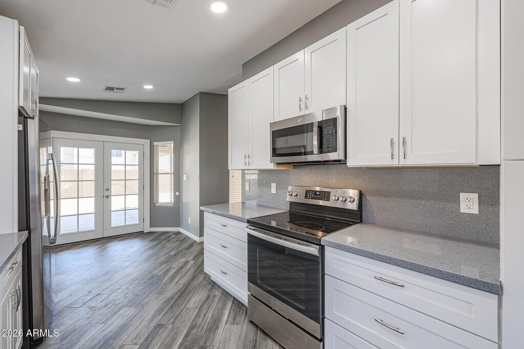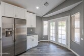 This Highly upgraded home offers 3 bedrooms/2baths with wood look tile through out. Tastefully done with 42'' white shaker cabinets,stainless steel appliances,the stove has a built in air fryer,pantry with pull out shelving & elegant grey quartz counters. The hall bath has updated vanity & light fixture. The master bath has a huge tiled shower,new counter tops on the vanity,upgraded fixtures and so much more. French doors off the kitchen & Master bedroom are new. There is a huge living room with a 2 way fireplace,new fans & light fixtures.The dining room is off the kitchen and views the 2 way fireplace. Covered patio with a large yard,Newer RV gates. Very easy access to I17 & 101 freeways,Hurricane Harbor water park,shopping & more.