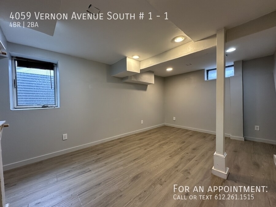 4 bedrooms, 2 baths Lower-Level unit, St Louis Park! Welcome to 4059 Vernon Ave S, a spacious 4 bedrooms, 2 bath Lower-Level unit of a Duplex with Vaulted Ceilings & beautiful shared Yard. This gorgeous unit offers comfort, character, and plenty of room to spread out. Located in a quiet residential area, the home provides easy access to nearby shopping, dining, parks, and major commuting routes while maintaining a neighborhood feel. Unit features large bedrooms with impressive, vaulted ceilings, creating an open and airy feel throughout the living spaces. Enjoy access to a beautiful, shared backyard, perfect for relaxing outside, hosting small gatherings. Unit Features: Large Kitchen area with plenty of counter space Vaulted ceilings that create an open Large rooms with plenty of living space Wood floorings Dishwasher Shared laundry on-site -Washer/Dryer TO SCHEDULE SHOWINGS, COPY/PASTE LIINK TO YOUR BROWSER: Rental criteria: Credit Score 650+ Household rent to income ratio=35% No felonies No evictions Must view the unit in person No history of missed payments/delinquents Application fee is $70 per adult/nonrefundable Max tenants= 5 Utilities paid by tenant- Gas, Electric, Cable/Internet/ and do Snow removal on sidewalks/walkways. Owner responsible for???