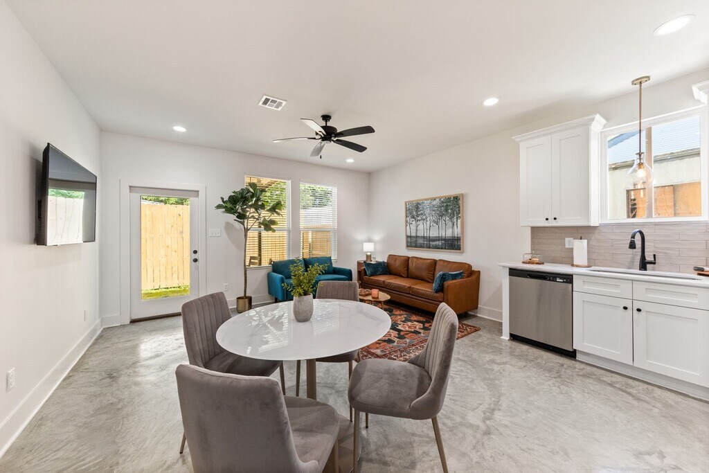 Enjoy the natural light throughout the spacious, open rooms. This beautiful, fully furnished townhome will feature granite countertops, luxury vinyl floors + stained concrete. The open feel extends to the private backyard with minimal maintenance needed. Located in the Enclave community that gives an urban environment and is designed to be pedestrian friendly with tree-lined sidewalks. The unit is provided with a garage and additional parking on the street. It is just minutes away from I-49 and the airport! This home is great for young professionals to young families to empty nesters, creating a true community. Call our office today at or email us at to schedule a tour!