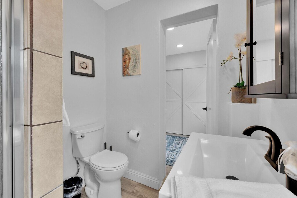 Fully furnished and remodeled 1 bedroom in the quiet area of Crown Point, one of San Diego's most cherished neighborhoods. This location offers the Pacific Beach lifestyle without the loud party scene or crowded streets. This fully renovated guest house is on the backside of the front property with a private gated entry way. It also includes a renovated kitchen, vinyl floors, dual pane windows, roman shades, fans, heat, Smart TV, Magic Bullet blender, security and access to a washer/dryer. Beach supplies include a cooler, 2 beach chairs, umbrella, and beach towels. General house cleaning once a month is included in rent! The bedroom has a comfortable Revive Series 6 queen size bed and upgraded amenities. The space has high speed wi-fi and a dedicated workspace if needed. There is also a cute outdoor patio space to relax, take in the fresh ocean air, and soak up some San Diego sunshine! We are less than a mile from the ocean and within walking distance to everything Pacific Beach and Crown Point has to offer. This includes cute coffee shops, amazing restaurants, bars, beach rental shops, and so on. We are also very conveniently located to many amazing attractions in San Diego (see list below for proximities). Attractions near You: *Sea World is 2.4 miles away *Sunset Cliffs is 5.5 miles away *Belmont Park/Mission Beach is 2.6 miles away *Seaport Village/Petco Park (Padres) is 9 and 10 miles away respectively *Balboa Park (San Diego Zoo and Museums) is 8.2 miles away *San Diego Airport is 6.3 miles away Please note that occasionally two small dogs enter through the shared yard. There is also a small tortoise, Lucky, that cruises through the backyard often! ** 6-8 month lease. $150/month for utilities (electricity, trash, water, sewer, WiFi)