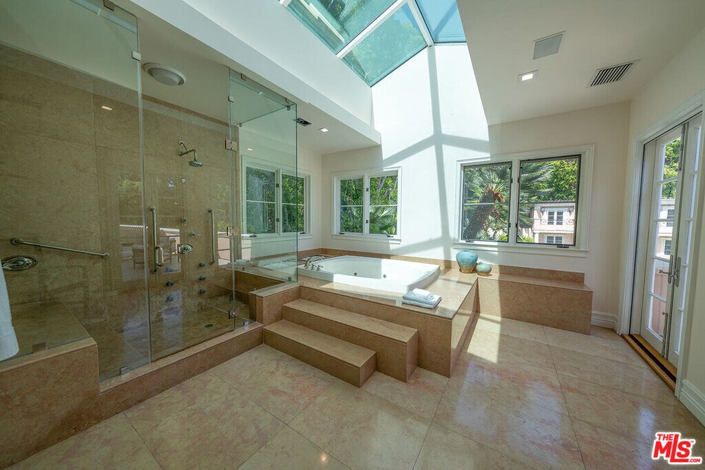 Perched above a long gated driveway, this Grand Mediterranean sits on over an acre of gorgeous resort-like grounds with night lit tennis court. Step inside double doors to discover impressive 2-story entry with skylights and marbled staircase. Enormous stepdown living room highlighted by fireplace, beautiful wood paneled office with wet bar, large formal dining room and decorative kitchen with top-of-the-line appliances, oversized center island and adjacent breakfast room. Extraordinary primary suite features another full living room with fireplace and two separate sumptuous baths highlighted by skylights, jacuzzi tubs, sauna and large walk-in closets. There are 4 additional family bedrooms upstairs, each en suite with walk-in closets and balcony access. Second staircase leads down to spacious family room with fireplace and game room/nook. French doors from almost every living space lead to expansive verandas with outdoor seating, built-in BBQ and pizza oven, and manicured gardens with lush grassy lawn perfect for entertaining! Detached 2-story 2bedroom guest house with kitchen overlooks enticing sparkling pool and spa. Temp controlled wine cellar, 2 staff quarters with shared living space, 2 laundry rooms, solar panels and 3-car garage complete this magnificent estate. MLS# 26673247
