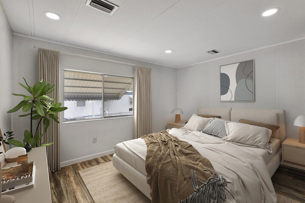 Rent to Own and ...Now Offering Owner Financing ....Monthly payment is $1,800 monthly , own your own mobile home for the price that you can rent. This is a renovated 3-bedroom, 2-bath mobile home. It has a brand new full-size kitchen with updated cabinets, a fully upgraded bathroom, and modern laminate flooring throughout. There are AC units in each room for added comfort. The home is located in a quiet 55+ community.