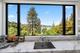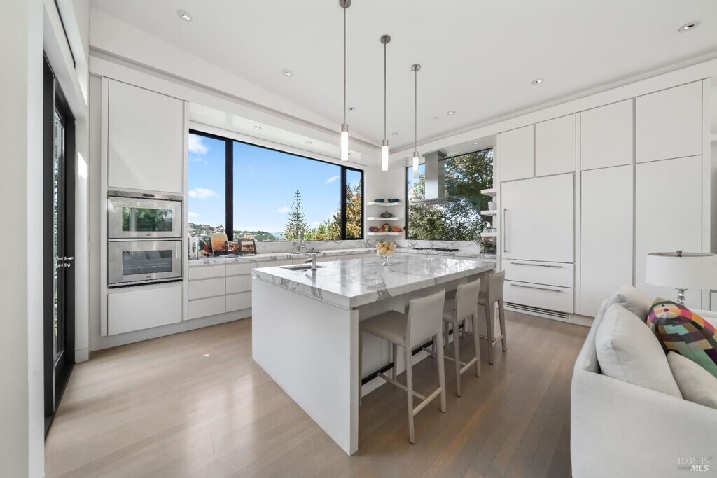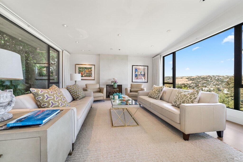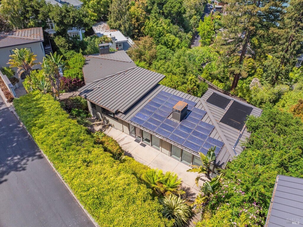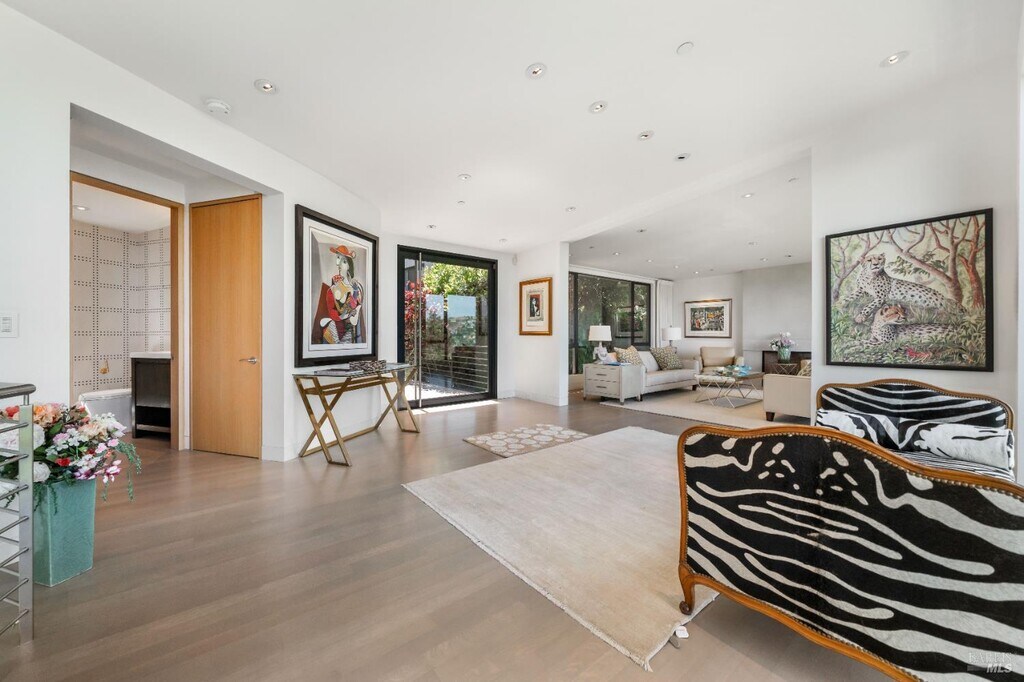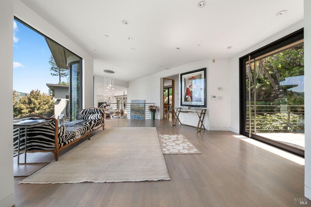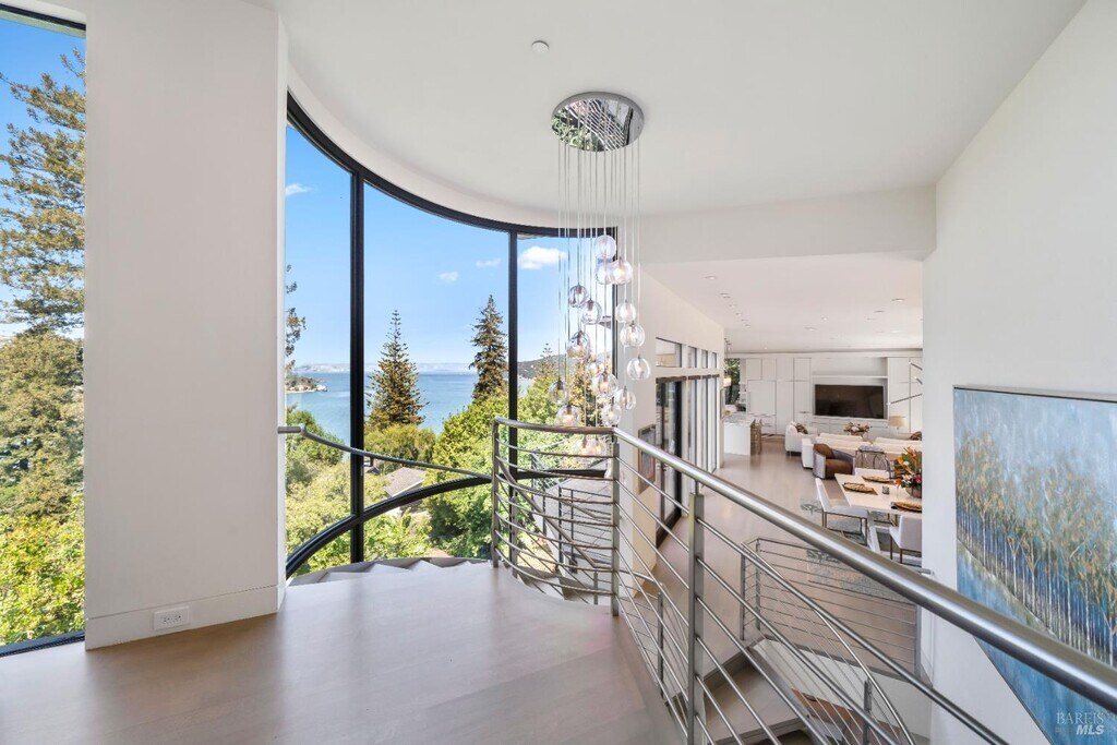 Spectacular Contemporary style home designed by renown architect Daniel Hunter AIA built in 2003 and renovated in 2014, this unique home with view of downtown Tiburon, Corinthian Island, 2 yacht clubs, Belvedere Cove and Angel Island features lush tropical gardens, a dramatic entry bridge, foyer with living room and an office & staircase w/curved glass walls descends to huge open-floor plan dining/family room/kitchen with high ceilings and wall to wall glass doors on both sides, luxurious primary suite, 2 en-suite bedrooms, sitting room and media room with full baths can serve as bedroom off pool level, detached guest quarter with full bath, beautiful pool with huge lounging terrace for outdoor entertaining, level turf athletic green lawn. Amazing turnkey home for Belvedere in best block at end of Golden Gate Avenue. Also offered for sale at $9,500,000 MLS#325099626