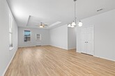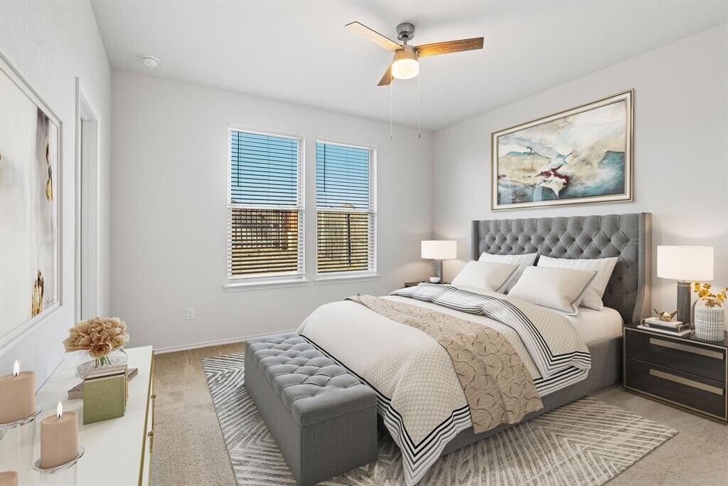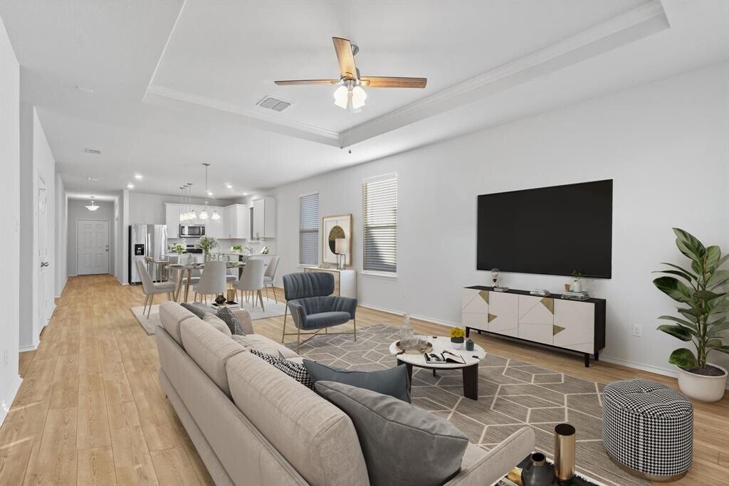 Pristine single-story gem nestled in the sought-after Sunfield community! Built in 2022, this immaculately-maintained residence exudes curb appeal with manicured landscaping, a covered front porch, and a convenient 2-car attached garage, offering a warm welcome every time you arrive. Step into a modern interior flooded with natural light, thanks to the open concept floor plan that's perfect for entertaining. Luxury vinyl plank flooring seamlessly connects the living areas, enhancing the sense of space and sophistication. High ceilings add an airy feel, creating an inviting atmosphere throughout. The heart of this home is undoubtedly the kitchen, a chef's delight featuring a center island, breakfast bar, sleek quartz countertops, shaker cabinetry, and high-quality stainless-steel appliances. The kitchen effortlessly flows into the adjacent dining area and the spacious living room, adorned with a tray ceiling and crown molding, providing a stylish backdrop for relaxation and socializing. Retreat to the primary bedroom, offering unparalleled privacy, a generously sized walk-in closet, and a spa-like en-suite bath. The primary bathroom is adorned with a quartz-topped dual vanity, a soaking tub, and a separate walk-in shower, providing a luxurious escape within the comforts of your home. Step outside to a sizable fenced-in backyard, complete with a covered patio, where you can unwind and enjoy the privacy afforded by having no immediate rear neighbors. The Sunfield community invites a vibrant lifestyle with a host of amenities, including a community pool, splash pad, lazy river, open-air pavilions, walking trails, fishing ponds, and more. Experience the perfect blend of modern living and community charm in this Sunfield sanctuary – your new home awaits! MLS ID 2306198