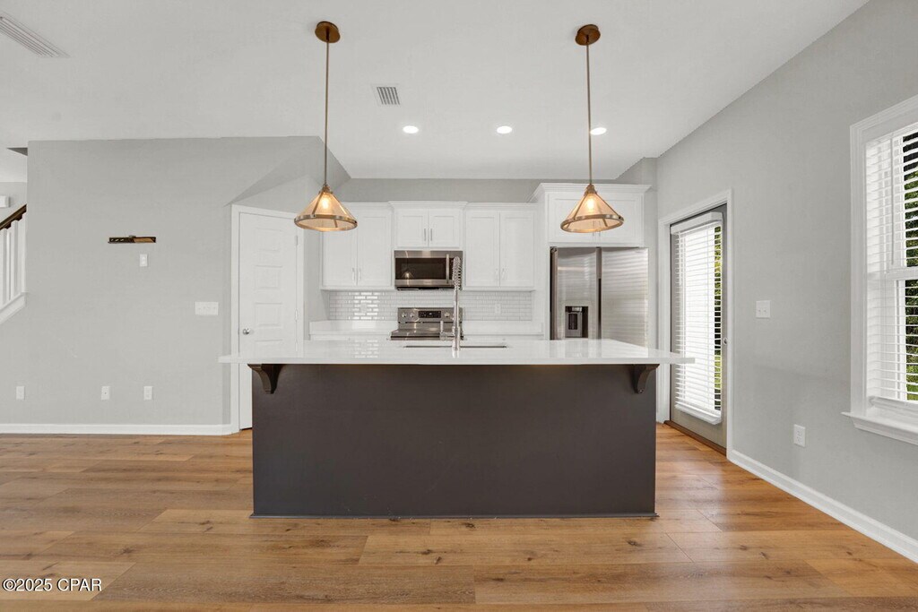 This like new 4 bedroom home is immaculate and has so much to offer! The beautiful kitchen includes stainless appliances , quartz countertops, an island all open to a dining area and great room. A spacious primary suite downstairs includes a soaking tub and separate shower. 3 additional bedrooms and a huge family room are upstairs. Enjoy a private back yard with deck. This home is set in a storybook neighborhood that includes a park for little ones. Dog allowed with approval from owner. Lawn Care included! Close to Tyndall and Mexico Beach!