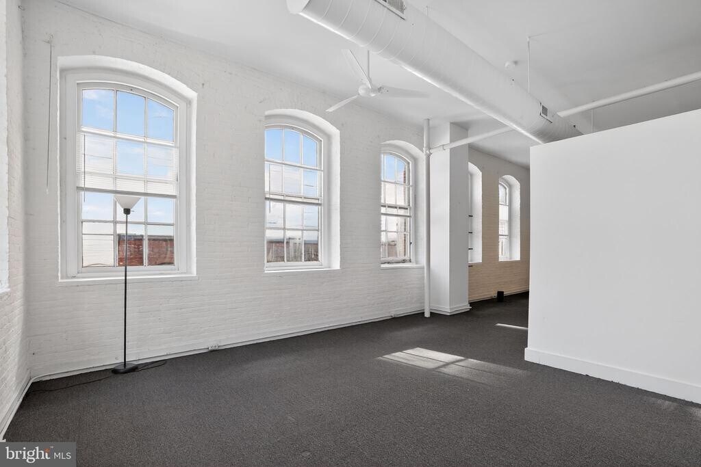 Spacious loft with large windows and tall ceilings. Located in a historically converted industrial building in Old City, this unit has wall-to-wall carpeting, tiled bathroom with shower/tub, huge closets (including a walk-in), and a storage loft. AC unit with ceiling fans, gas heat & on-site laundry. On-street resident permit" parking available throughout neighborhood, however, monthly off street parking may be available for additional charge. Easy access to public transportation and only a short walk to Center City. We look forward to hearing from you."