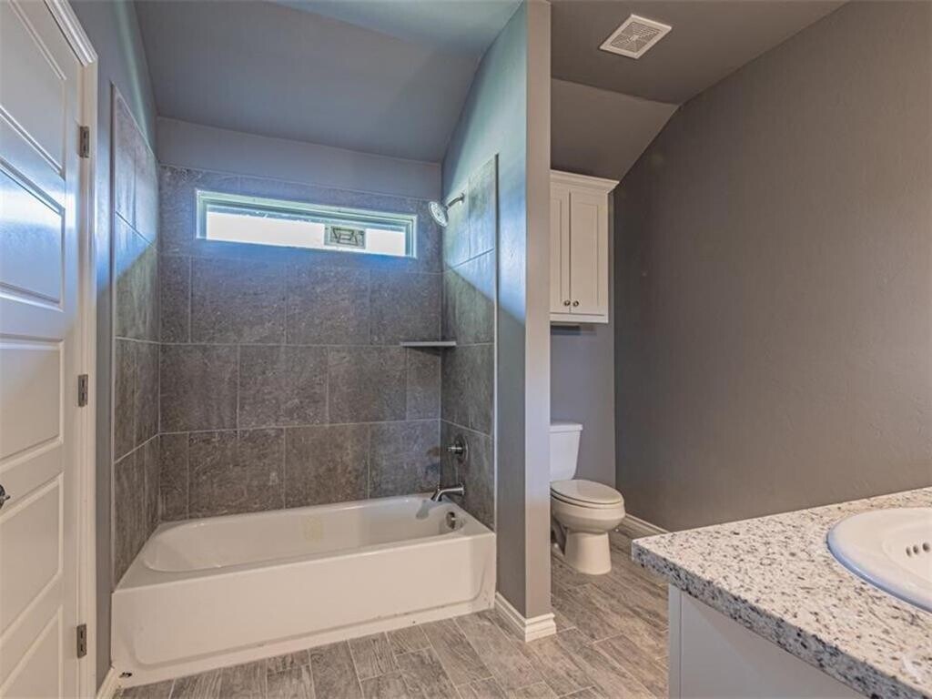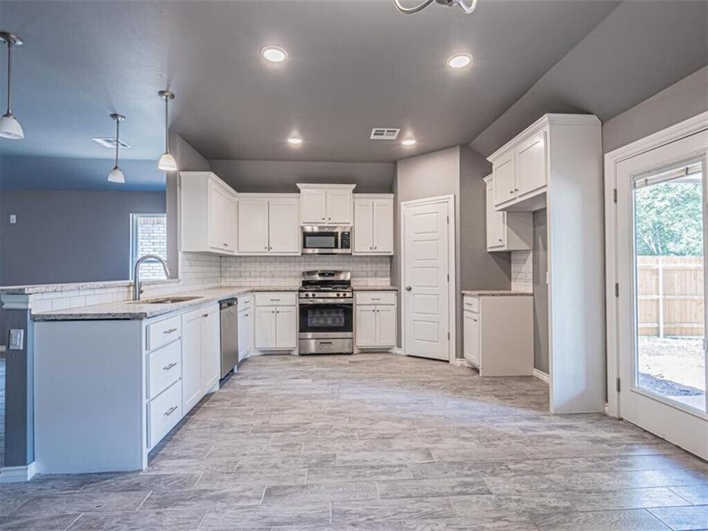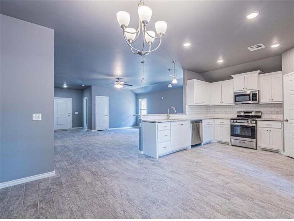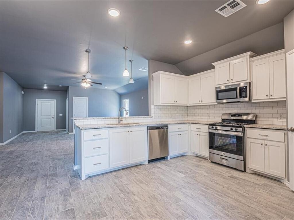 This 4-bedroom,2-bathroom home features an open-concept living area with natural light. The kitchen includes ample cabinets,generous countertops,a corner pantry,and stainless steel appliances,including a microwave,dishwasher,and gas range. A fourth bedroom overlooks the covered front porch. The primary suite at the rear of the home includes a walk-in closet and ensuite bathroom. Ceiling fans are installed throughout. A dedicated laundry area with washer and dryer hookups adds convenience. The exterior includes a fenced backyard with a covered patio and an attached 2-car garage with additional storage space. The property is located in a quiet neighborhood,with nearby schools,shops,restaurants,and community amenities. Don’t miss out! Schedule a tour today to view this property.