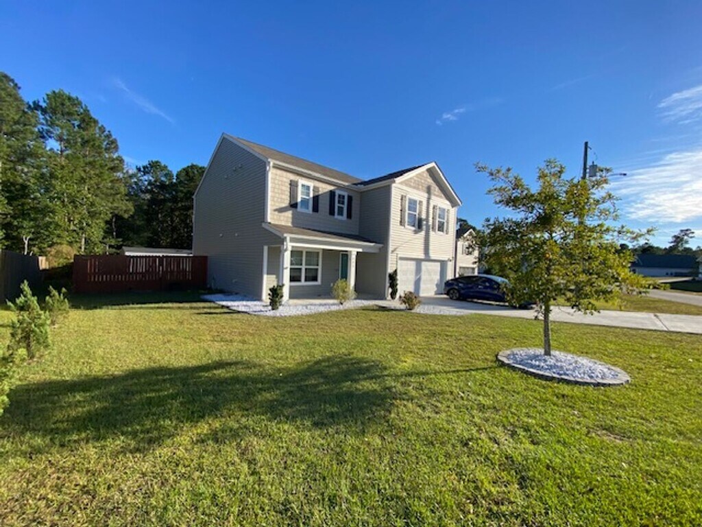 Welcome to 409 High Ridge Court - a move-in-ready haven! This home boasts freshly painted living rooms and bedrooms, creating a vibrant atmosphere. Just an 8-minute drive to the Stone Bay Gate leading into Camp Lejeune. This spacious 4-bedroom, 2.5-bathroom residence, constructed in 2020, is nestled on a serene almost acre lot, and is close to all conveniences. The open kitchen features white cabinetry, tile backsplash, a walk-in pantry, and modern stainless steel appliances. The first floor showcases durable LVP flooring, offering a sleek and clean aesthetic and updated bath and vanity. Upstairs, discover a well-designed floor plan placing all four bedrooms strategically. Access the backyard through the sliding glass door off the living room to find a newly fenced-in oasis with a spacious shed at the back. Electrical upgrades include a 50-amp outlet on the exterior for easy generator connection and a 20-amp outlet installed in the garage. Enjoy ample privacy with woods behind the property and one of the largest lots in the community. On the weekends, look forward to the convenience of a 10-minute drive to the beach!