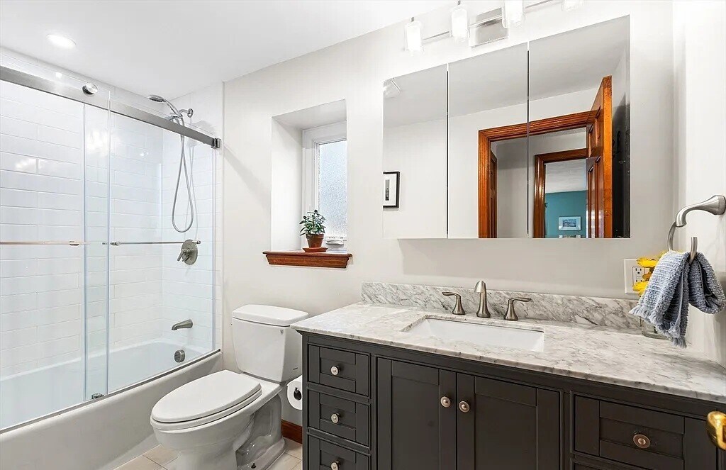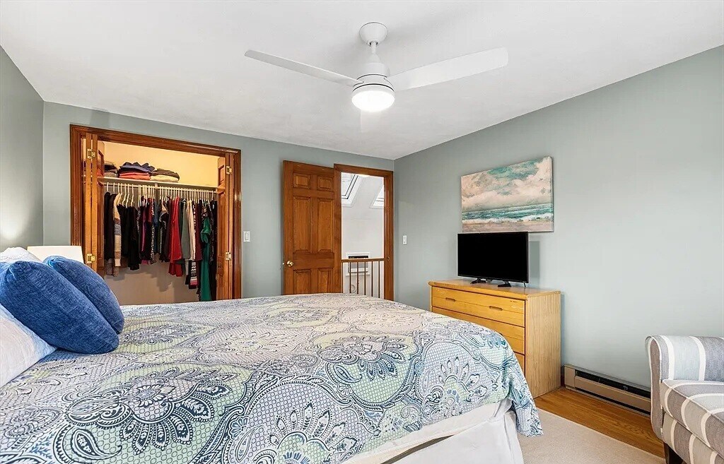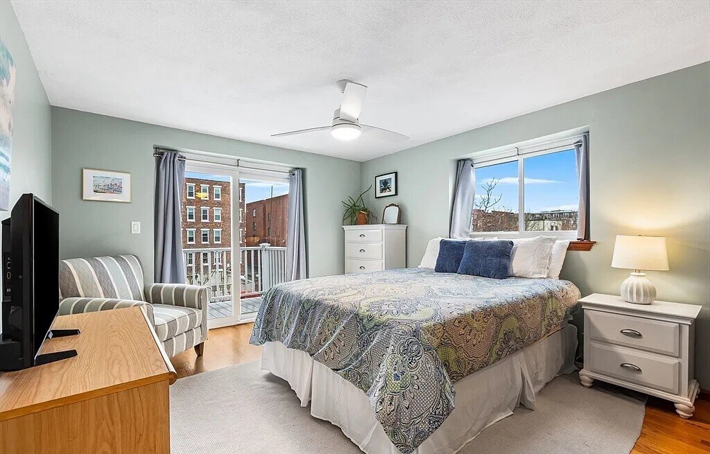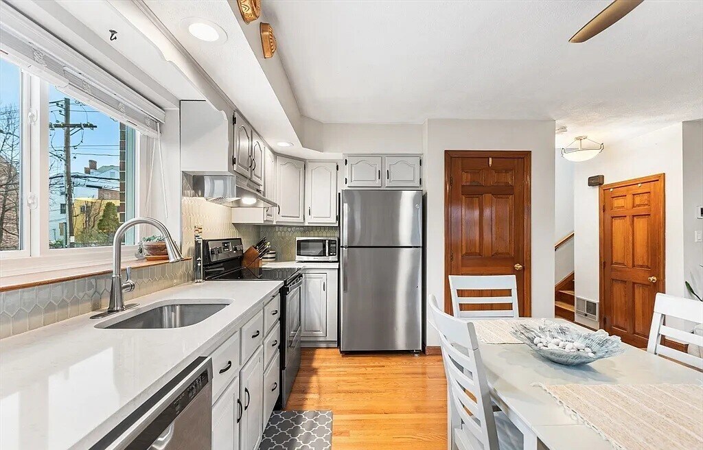 Featuring 2 spacious bedrooms, 1.5 baths, 2 private outdoor spaces (patio & balcony), & a deeded parking spot. The main level offers great flow w/ an inviting living/dining area, an updated kitchen w/ quartz counters, SS appliances, new sink, painted cabinets, & a stunning backsplash, plus access to the private patio. Additional first floor conveniences include: a half bath w/ laundry & 2 large closets. Upstairs, both bedrooms have overhead lighting, double closets & access to a nice composite balcony, w/ views of the East Boston Greenway. The sun pours in on both levels from the recently re-done skylights. Other recent upgrades include the full bathroom gut renovation