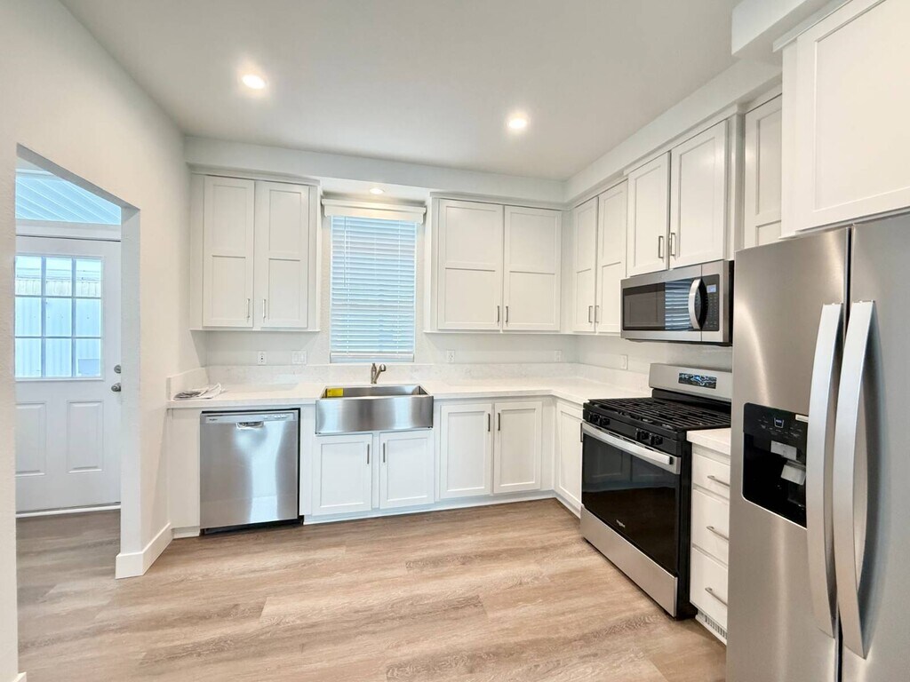 Welcome to this outstanding Anaheim rental home. Discover this stunning brand new 2025 manufactured home located in the desirable Rancho La Paz mobile home park in Anaheim. With 2 bedrooms and 1 bathroom spread across 990 square feet, this residence features a split floor plan and a large side yard, perfect for outdoor activities. Enjoy covered parking for two vehicles, dual-pane vinyl windows throughout, and a dog-friendly community. The home also includes a storage shed and is situated in a gated community, just steps away from shopping and dining options. Inside, you will find modern finishes with all-new interior features, including white shaker style cabinets with soft-close hinges, stainless steel appliances, and gorgeous quartz countertops. The open living room is filled with natural light from tall windows, complemented by luxury vinyl plank flooring and plush carpeting in the bedrooms. Each room is equipped with ceiling fans for comfort, and mirrored closet doors add a touch of elegance. Additional conveniences include a washer/dryer unit and central heating. Residents of Rancho La Paz enjoy fantastic community amenities, including a sparkling pool, large spa, dining facilities, a game room, and a spacious gathering hall, along with picnic areas and pet-friendly spaces. Don't miss your chance to make this beautiful home your own!
