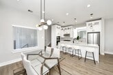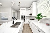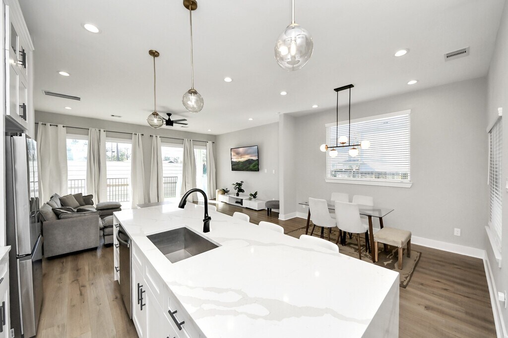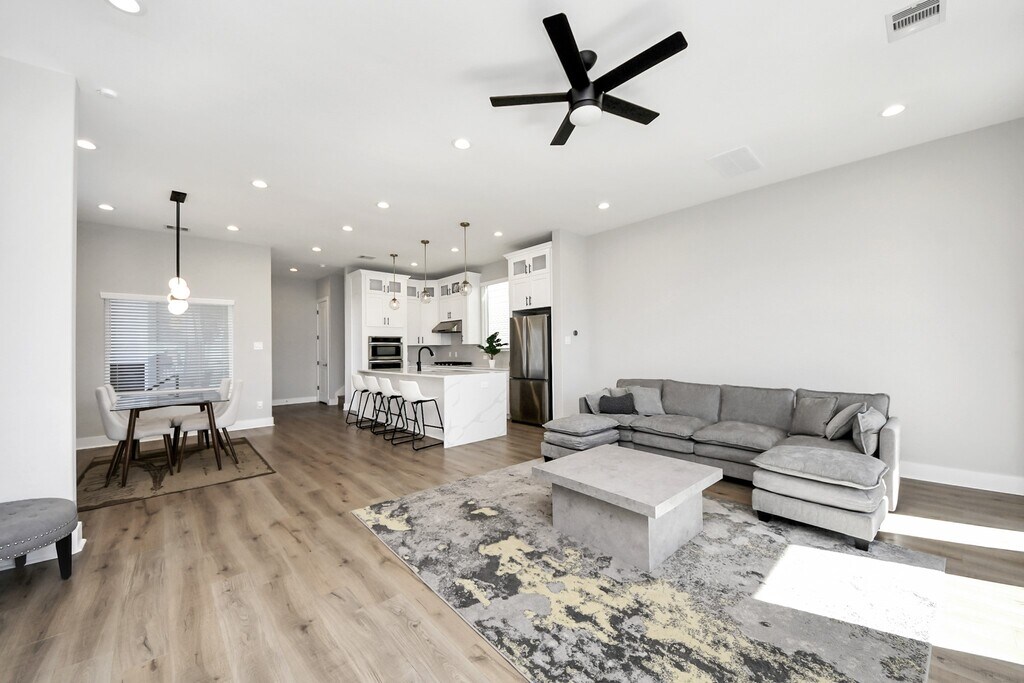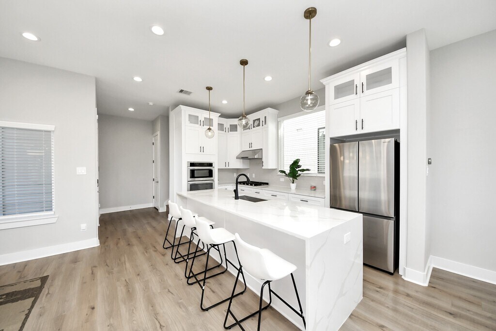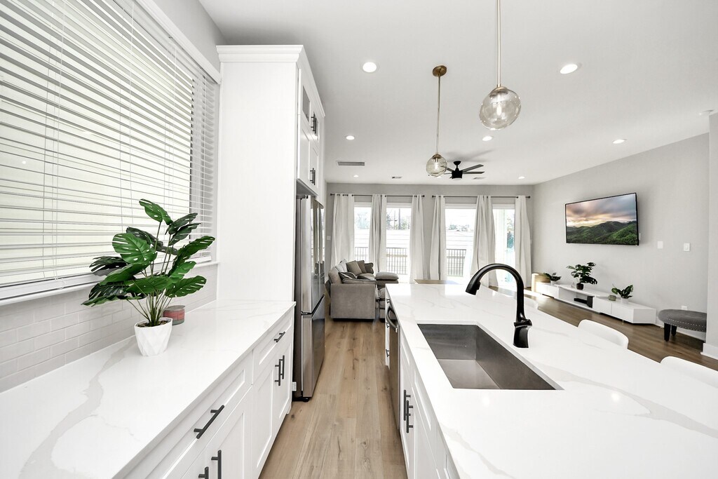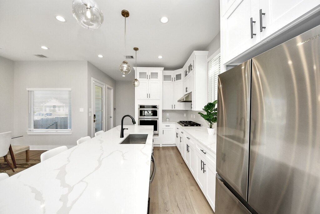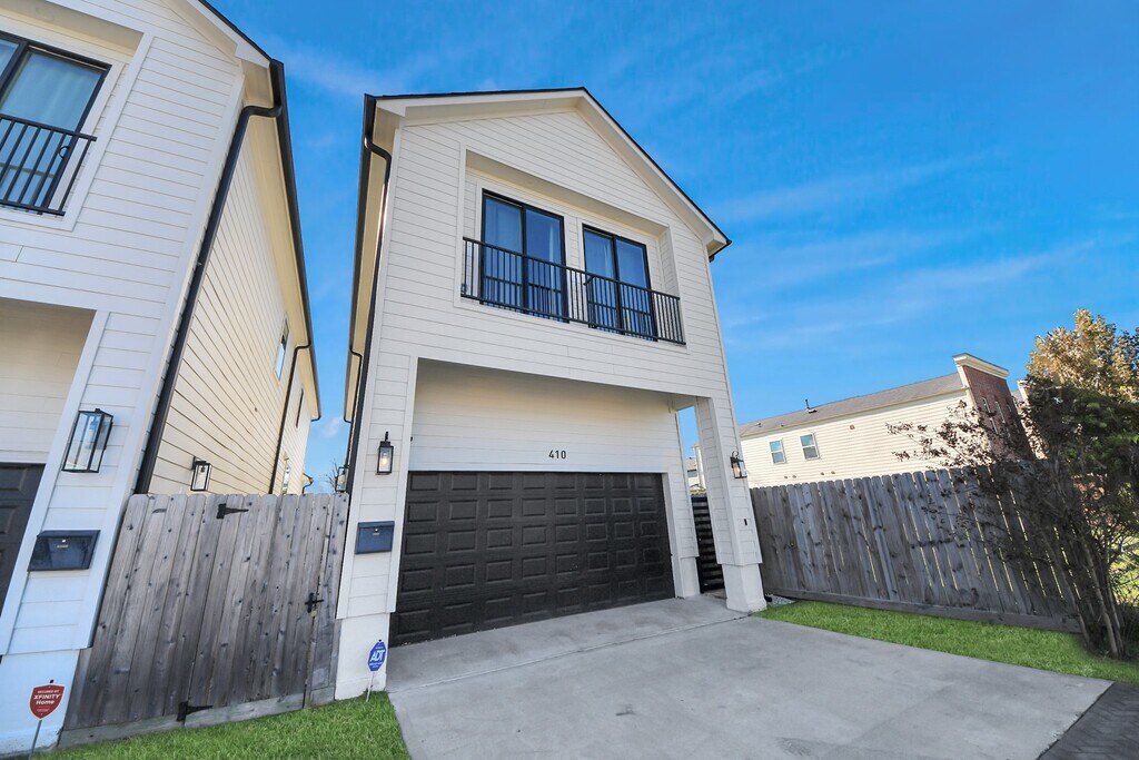 Welcome to 410 E 41st St,a modern newer-construction home located in a rapidly growing area of Independence Heights. Built in 2022,this fully furnished 3-bedroom,2.5-bath residence offers approximately 2,100+ sq ft of open-concept living with high ceilings and abundant natural light. The kitchen features an oversized quartz waterfall island,floor-to-ceiling cabinetry,stainless steel appliances,and a gas cooktop,ideal for daily living and entertaining. All bedrooms are upstairs with walk-in closets and direct bathroom access. The primary suite includes a private balcony,built-in office nook,and a spa-inspired bath with dual vanities,soaking tub,and glass-enclosed shower. Additional highlights include smart-home features,backup power panel,refrigerator/washer/dryer included,custom window coverings,covered patio,low-maintenance turf yard,attached two-car garage,and no HOA. Convenient access to Loop 610,The Heights,dining,and shopping. MLS# 33420209