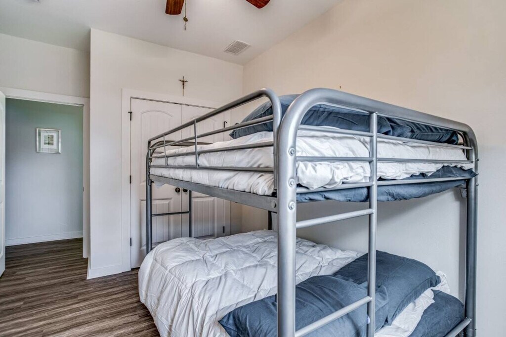 Feel at home in this newly built home near downtown Pensacola and Pensacola Beach. This Garden District home is ideal for families, business professionals, or anyone seeking great value near all Pensacola has to offer. The living room features a television and board games, with complimentary Netflix via the attached Roku. The kitchen is fully equipped with a full stove, microwave, fridge, toaster, dishwasher, utensils, knives, and glassware. The first bedroom has a king-size bed, a dresser/side table, and a small closet. The second bedroom has a twin over twin bunk bed with a desk and small closet. The third bedroom (AKA Master Bedroom) has a queen-size bed with a walk-in closet, a dresser, and two side tables. The master bath has a walk-in shower, two sinks, and a bidet attached to the toilet. The hall bathroom has a tub shower and one sink. At the end of the hallway is a laundry room with a washer/dryer and cleaning supplies. The backyard has a fire pit with two lawn chairs and a clothesline. The front yard has space for one car and a small patio. Pets are welcome with a non-refundable fee. Located on N C Street just west of downtown Pensacola, this home is in close proximity to a variety of things to do in Pensacola and nearby beaches, and is also close to Bayview Dog Beach. It's a 5-minute drive to Seville Quarter, 10 minutes to NAS Pensacola and Corey Station, a 3-minute drive to Blue Wahoos Stadium, and a 20-minute drive to Pensacola Beach. While the area is walkable to a few restaurants, driving is recommended, though Uber and Lyft are readily available. Quiet hours are between 10 PM and 7 AM. You must be at least 21 years of age to rent this property. If there are any signs of smoking cigarettes, vapes, e-cigs, pipes, etc. (smell, ash, etc.) in or around the home, an automatic $500 damage charge will be incurred. The same charge applies if cigarette butts are found outside of the home. If marijuana is smoked in or around the home a $500 fee will be charged, and details about the reservation may be turned over to the appropriate authorities. Parties are prohibited at the home. If you violate quiet hours and disturb the neighbors, your reservation will be canceled; you will be required to leave the property immediately and you will not be eligible for any refunds. If pets are left unattended in the home, they must be crated. Pets are not allowed on furniture or beds, and all waste must be cleaned up from the yard. If there is evidence of pet hair on the furniture, excess hair in the home, stains, or waste found in the yard or home, you will be charged the cost to clean this. There is a $100 charge for third party trash removal if an excessive amount of trash is left at the property. [SI]