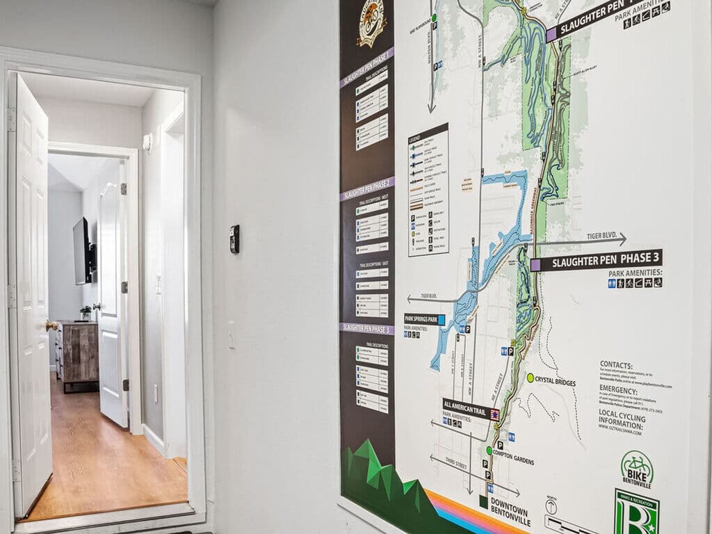 Ride, relax, and repeat at Coler Lounge, your modern mountain biking basecamp in Bentonville. This 3-bedroom, 2-bath home offers bike-in/bike-out access, a private hot tub, and secure bike storage. Located just minutes from Coler Mountain Bike Preserve, it provides the perfect setting for MTB trips, group getaways, or couples seeking to soak up the Ozarks’ outdoor charm. Built with cyclists and outdoor lovers in mind, this home comfortably hosts up to six guests in a spacious, stylish setting. It features three bedrooms with premium linens, two full baths with fresh towels and complimentary toiletries, and a fully stocked kitchen with cookware, a coffee maker, a dishwasher, and modern appliances. The open living and dining area is great for groups to connect, unwind, or share meals. In-unit laundry is available for guest use, and fast Wi-Fi makes it perfect for remote workers or post-ride route planning. Relax your muscles in the private hot tub after a long day on the trails, and take advantage of the secure bike storage, hose for washing, and garage space available. Free on-site parking is available, and bike-friendly routes connect you to Coler, Slaughter Pen, and downtown. Rideshare services like Uber and Lyft are readily available in the area. Situated on a quiet street, Coler Lounge offers direct access to Bentonville’s top trails and is less than a 5-minute ride or drive to Downtown Bentonville. Enjoy craft beer, gourmet dining, boutique shopping, and iconic attractions like The Momentary and Crystal Bridges Museum of American Art. The peaceful neighborhood provides the best of both adventure and rest. Smoking is strictly prohibited inside the house, and pets are not allowed at any time on the property. No parties, events, or large gatherings are permitted. This home is best suited for small groups or families. Please be respectful of the neighbors and observe quiet hours from 10:00 PM to 8:00 AM. Violation of any house rules will result in fines of $250, along with the cost of any damages and/or extra cleaning costs. Check-in is after 4:00 PM, and check-out is by 11:00 AM. If you need a late check-out, we’ll do our best to accommodate. The hot tub is located on the back porch, and hot tub towels are in the hall closet. Turn off the jets after use, and use plastic cups for drinks in the hot tub area. Rinse off before entering the hot tub to keep the water clean, and ensure no children are in the hot tub without adult supervision. [SI]