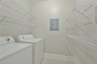 Beautiful open layout condo with high ceilings in prime Vinings location. Easy access to 285, 75, the Battery, and in-town. 2 bedrooms (both with large walk-in closets), 2 bathrooms (master bath has separate tub and shower, 2 sinks), extra large linen closet, in-unit laundry with large laundry room, gas fireplace, new hardwood floors in main living area and new carpet in bedrooms, freshly painted. Gated community, pool with grilling area, and workout room.
