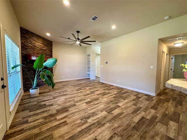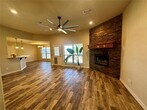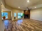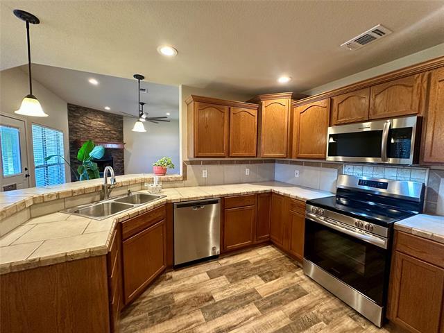 Wonderful 4 bedroom brick home near the front gate of Indian Harbor. Great open floor plan with beautiful barn wood style, tile floors throughout. The living room is anchored by an awesome floor to ceiling stacked stone, wood burning fireplace, and large windows that bring in lots of light. The kitchen features a big dining area, pantry, breakfast bar and stainless appliances that includes an electric self-cleaning range with convection and air fry. The master suite is split from the secondary bedrooms and offers dual sinks, dual walk-in closets, a garden tub, separate shower and extra linen storage. You'll appreciate special touches like the oversized utility room with sink, 2 coat-utility closets at the front of the house and walk-in closets in every bedroom. The backyard is a spacious, privacy fenced oasis. Large live oak trees frame a beautiful sitting area with a pond and firepit, and raised garden beds await next spring's planting. This home sparkles and reflects the landlord's attention to detail. You'll find it easy to make this one home!