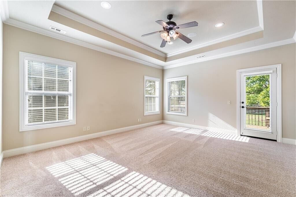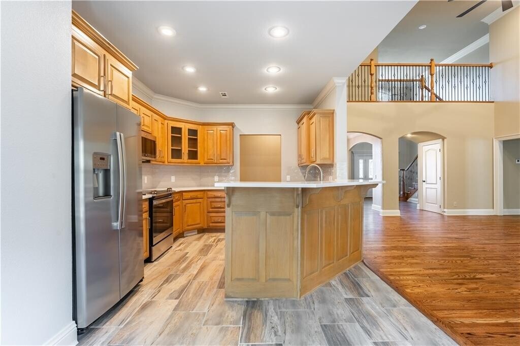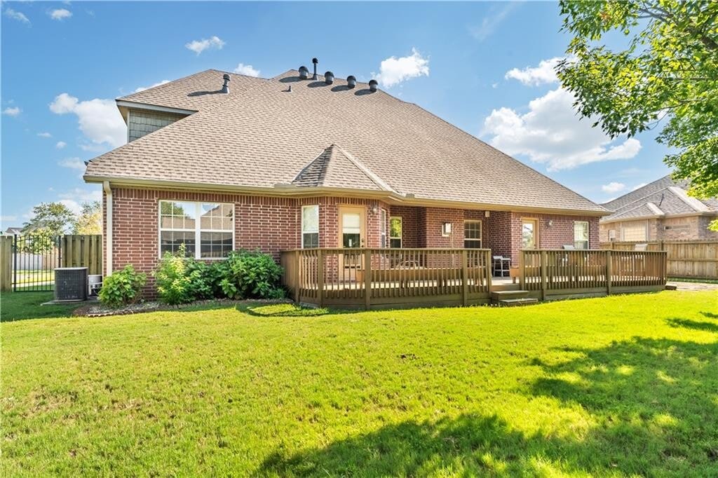 Spacious 4 bed, 3 bath, 3 car garage home on corner lot 2 minutes from new Walmart Corporate Campus, & I-49 via new Exit 87 interchange. Main level open floor plan w/high ceilings & hardwood floors; eat-in kitchen w/bar counter, abundant cabinet storage & upgrades of new quartz counters, backsplash & flooring; primary suite w/dual vanity bath, garden tub, separate shower, & walk-in closet, + rear deck access; MIL suite/guest bedroom & full bath; and separate laundry. Living room with gas log fireplace. Some rooms repainted & new lights in living spaces on main level. Second level has 2 bedrooms w/Jack & Jill full bath, plus a Media/Bonus Room. Large rear deck w/built-in benches. In-ground storm shelter in garage & 3rd bay ideal for exercise room or storage. Landscaped w/sprinkler system. Refrigerator, washer & dryer included in rent. Pest control & lawn maintenance included. Tenant responsible for utilities & renters insurance. No boats, trailers, RV's or vehicles over 3 tons & no parking in the street allowed. MLS# 1337249