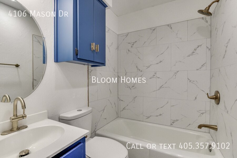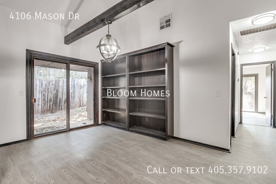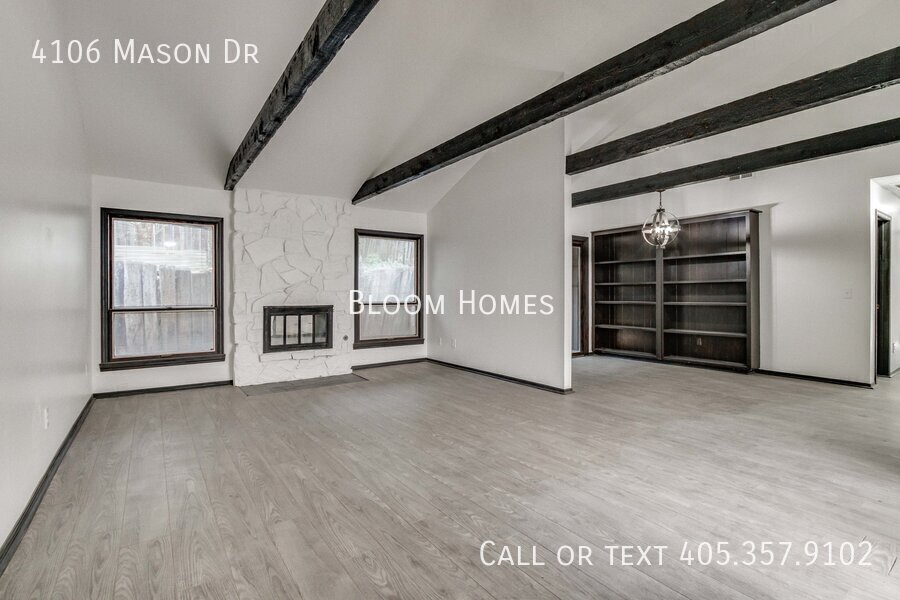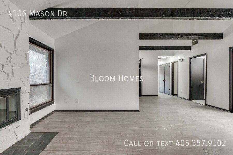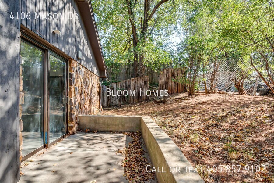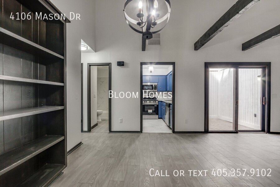 Welcome to 4106 Mason Dr, a 1,355 sq ft, 2 bed / 2 bath retreat with serious style and an easy indoor-outdoor flow. Step into the vaulted living room where exposed beams and a sleek stone fireplace set the tone. Two sets of sliding glass doors pull in natural light and open to multiple private patios—morning coffee here is a ritual. Built-in shelving frames the dining area, while a bright skylit atrium/courtyard brings sunshine into the heart of the home (hello plant paradise/art nook). The kitchen pops with bold blue cabinetry, marble-look counters, and stainless steel appliances (gas range, microwave, dishwasher, French-door fridge). Down the hall, the spacious primary suite offers patio access, a double-vanity bath, and a true walk-in closet. A second bedroom and full bath give you flexible space for guests, an office, or a studio. Durable, low-maintenance flooring runs throughout. Outside, the long private drive leads to a two-car garage—room for cars, bikes, gear, and projects. You’re tucked into NW OKC near shopping, dining, and quick routes around town,quiet when you want it, convenient when you need it. You’ll love: - Vaulted ceilings with exposed beams - Stone fireplace focal wall - Skylit atrium/courtyard + multiple patios - Blue modern kitchen w/ stainless appliances - Primary suite w/ patio access, double vanity, walk-in closet - Two-car garage + extra-long driveway - Sun-splashed sliders in living and bedrooms This isn’t a copy-paste 2/2, it’s a mood. Come feel the light, the volume, and the flow at 4106 Mason Dr. Schedule your tour today. 12-month lease. Household income must be 3x monthly rent. Tenant responsible for lawn care and all utilities. No smoking Bloom Real Estate is proud to offer deposit-free living to qualified renters through Obligo! We understand that moving costs can add up, so we want to extend financial flexibility to our residents. When you move in with us, you can skip paying a security deposit and keep the cash for activities you care about. Learn more about the benefits of deposit-free living on their website