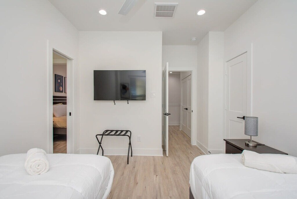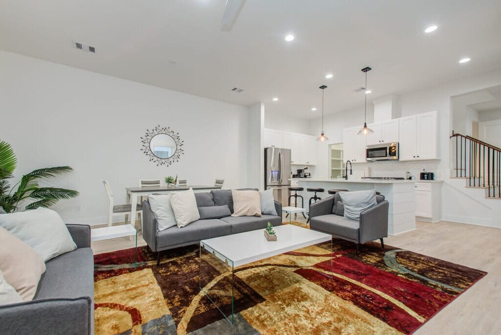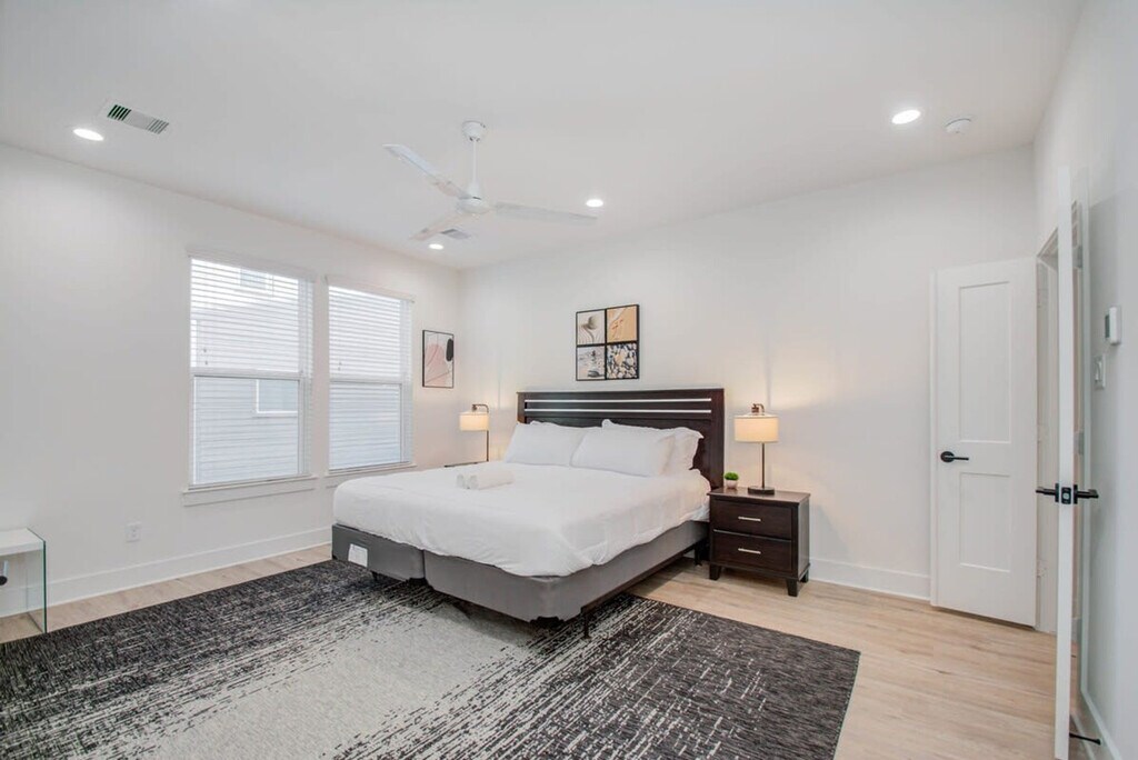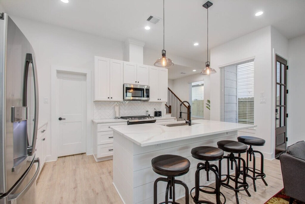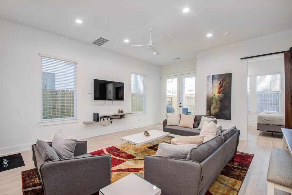 Experience the allure of Northeast Houston with this newly built, immaculate home featuring a beautiful open-concept layout, an upgraded kitchen, and high-end finishes. Conveniently located, this property offers easy access to Houston's main attractions and restaurants, ensuring you never have to worry about long commute times. Welcome to the heart of Houston at the Bryan Heights Villas. This centrally located vacation home offers a modern farmhouse vibe with upgraded features, catering to both short-term and medium-term stays. The fully equipped kitchen includes stainless steel appliances, a kitchen island with bar stool seating, and all basic cooking essentials. The open-concept dining area provides seating for six at the table and four at the breakfast bar, perfect for socializing. The bright and spacious living room, with its curated décor, flat-screen TV, and high-speed Wi-Fi, opens directly to the fenced backyard through glass patio doors. Free parking is available in the garage and on the driveway, with additional street parking if needed. We welcome house-trained pets with a non-refundable pet fee of $150 per pet, with a maximum of two pets per stay. An additional nightly rate applies for more than six guests, with a $29/night fee for each extra guest. Welcome to Houston, a city known for its tasty Tex-Mex and contributions to space and science. While here, explore the culinary scene and nearby attractions such as the Houston Museum of Natural Science, Minute Maid Park, and vibrant neighborhoods like Midtown and Montrose. The property is just minutes from major freeways, making it easy to explore the city. This property strictly prohibits parties or large unauthorized gatherings. A noise alert device is installed to monitor decibel levels and ensure compliance with local noise ordinances. Smoking is not allowed, with violations subject to a $450 fine plus cleaning and repair costs. Check-in is at 4pm and checkout is at 10am. Pets should be discussed in advance, and pet cleaning fees apply. The property includes security cameras for compliance with local laws, but no cameras are in private areas. The home is remote work-friendly with high-speed Wi-Fi and ample space for setting up a workstation. [SI]