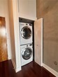 Penthouse loft with volume ceilings, real wood floors throughout, impact windows and doors. This is a 2 room, 1 bath loft with full size washer and dryer inside the unit. Open floorplan with large closet with built ins. One parking space assigned in garage and additional space can be rented monthly though.