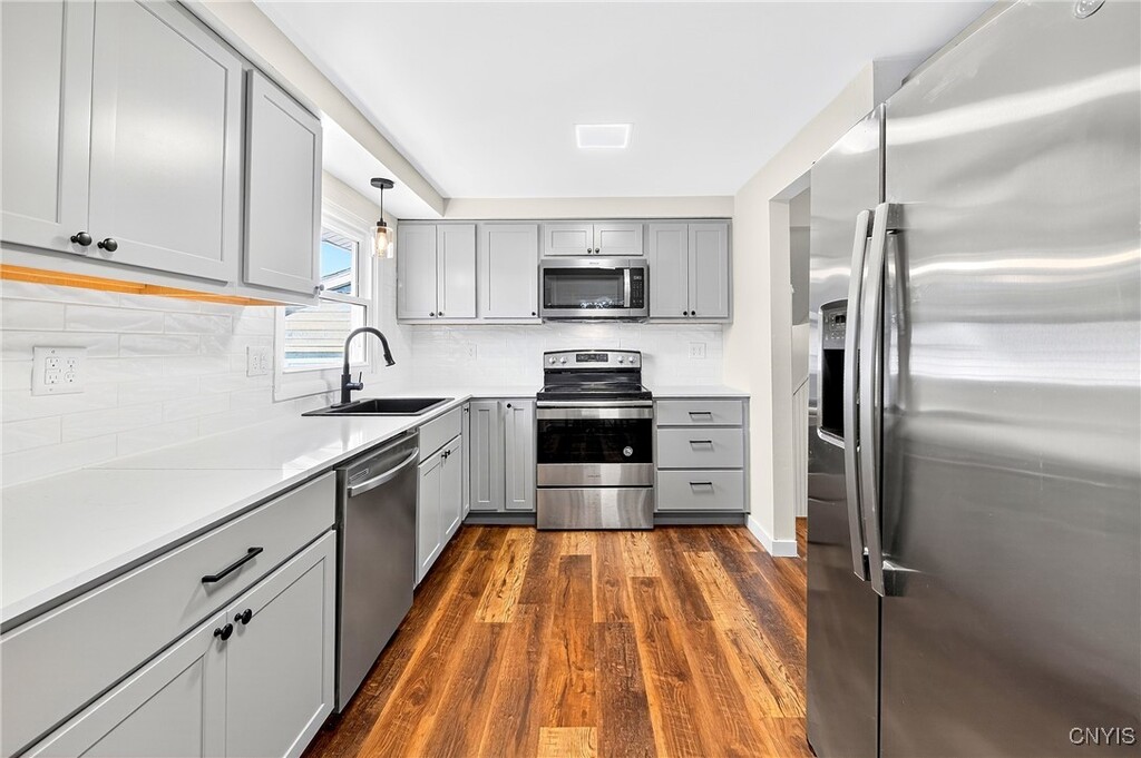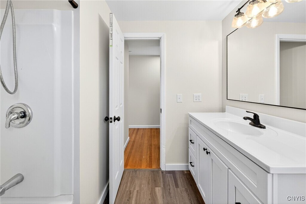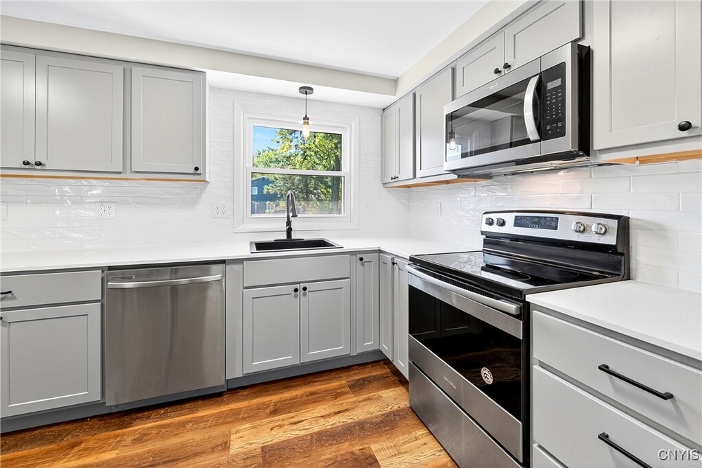 Welcome home to this beautifully updated 3-bedroom,1.5 bath split-level in the Liverpool School District? This home features gleaming hardwoods throughout,a bright and spacious layout with modern updates throughout. Enjoy a sunroom,a large deck perfect for relaxing or entertaining,and a great yard for outdoor living. Conveniently located near shopping,dining,and highways,this home is move-in ready and waiting for you!