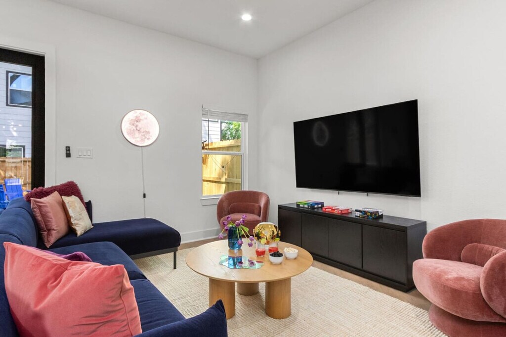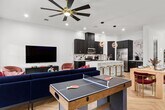 Discover comfort and style in this modern 4-bedroom, 2.5-bath home near NRG Stadium, the Medical Center, and downtown Houston. Enjoy a chef’s kitchen with quartz countertops and a wine fridge, spacious bedrooms, smart TVs, an EV charger, gated entry, and in-unit laundry. Relax with indoor ping pong and shuffleboard, or unwind outdoors with a firepit and movie projector. Perfect for families, groups, or professionals seeking a high-end stay. This modern 4-bedroom, 2.5-bath home comfortably sleeps up to 10 guests. Three spacious bedrooms feature king-size beds, while the fourth includes two full-size beds—perfect for families or groups. The open-concept living area includes a large smart TV, stylish furnishings, and a dining table for eight. Enjoy a fully equipped kitchen with stainless steel appliances, quartz countertops, and a wine fridge. Entertainment options include ping pong, shuffleboard, and a cozy outdoor lounge with a firepit and movie projector. Private driveway, gated entry, EV charger, high-speed Wi-Fi, and in-unit laundry included. Free parking is available on-site, and guests with electric vehicles will appreciate the EV charging station. Located in a growing and accessible area of Houston, this home offers a quiet residential setting with quick access to the city’s top attractions. Just minutes from NRG Stadium, the Texas Medical Center, and downtown, guests can enjoy a perfect balance of peace and proximity. The neighborhood is ideal for families, professionals, and travelers seeking convenience without the noise of downtown. Nearby, you'll find local eateries, grocery stores, parks, and public transit options, making it easy to explore everything Houston has to offer while enjoying a restful and secure home base. This home is located in a quiet residential neighborhood, so guests are kindly asked to observe quiet hours from 10 PM to 7 AM. Parties, events, and unauthorized guests are not allowed. For your safety, there is a security system with exterior cameras. The property includes a remote-controlled gate, driveway parking, an EV charger, and a generator interlock system. Smart TVs are provided and require your own streaming logins. Check-in is after 4 PM, and check-out is by 11 AM unless otherwise arranged. Smoking or vaping is not allowed indoors, and pets are not permitted. If anything is damaged or not functioning properly, let us know right away so we can address it promptly. We’ve designed this home to offer both comfort and convenience, and we’re here to help should you need anything during your stay. [SI]
