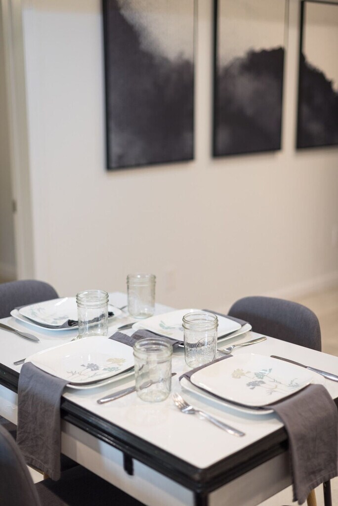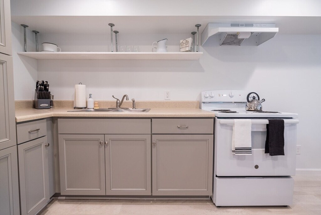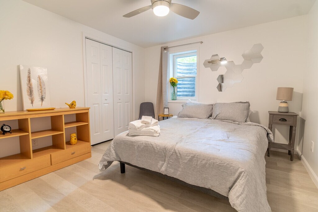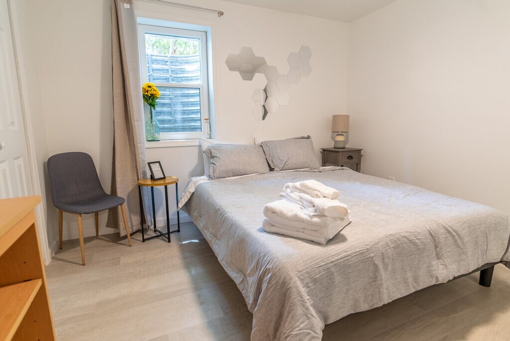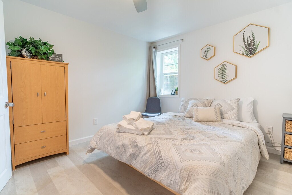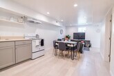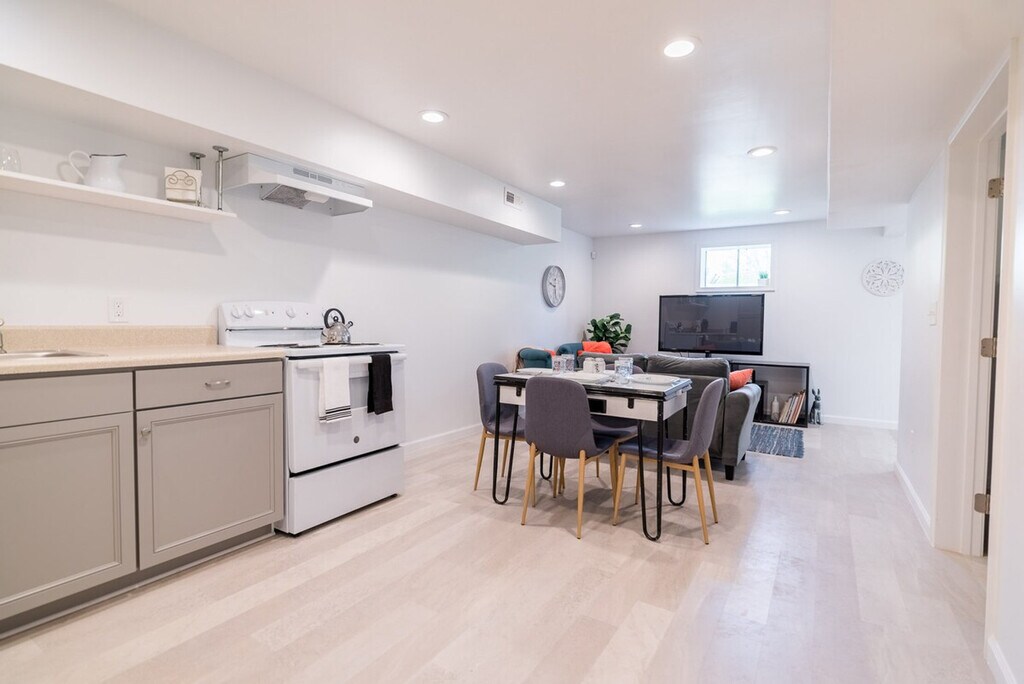 Feel at home in this recently finished basement apartment, the perfect place for 1-4 guests to spend a month or more in Charlottesville. This apartment has its own parking and a separate exterior entrance. This basement apartment uses an open floor plan in the kitchen/living space to give this cozy space a wide-open feel. The beautifully tiled bathroom is the perfect complement to two inviting bedrooms, each with plenty of storage. Guests also have their own private washer/dryer for en-suite laundry at no additional cost. This home uses energy-efficient lighting and appliances, and all provided paper products (TP and paper towels) are sustainably sourced using bamboo. This basement apartment has its own HVAC zone and thermostat. All basic amenities, including clean linens and shower supplies, are included, as well as ground coffee and kitchen basics. Wonderfully located approximately 1 mile from Scott Stadium and UVA, approximately 2 miles from UVA Hospital and the Downtown Mall, and less than 1 mile from i64, all of Charlottesville is just a short drive away. You are welcome to use the spacious 0.5-acre backyard anytime you like. Because the host lives above the apartment and has a baby at home, they ask that you keep noise levels down between 9:00 pm and 8:00 am, and they do the same for you. [SI]