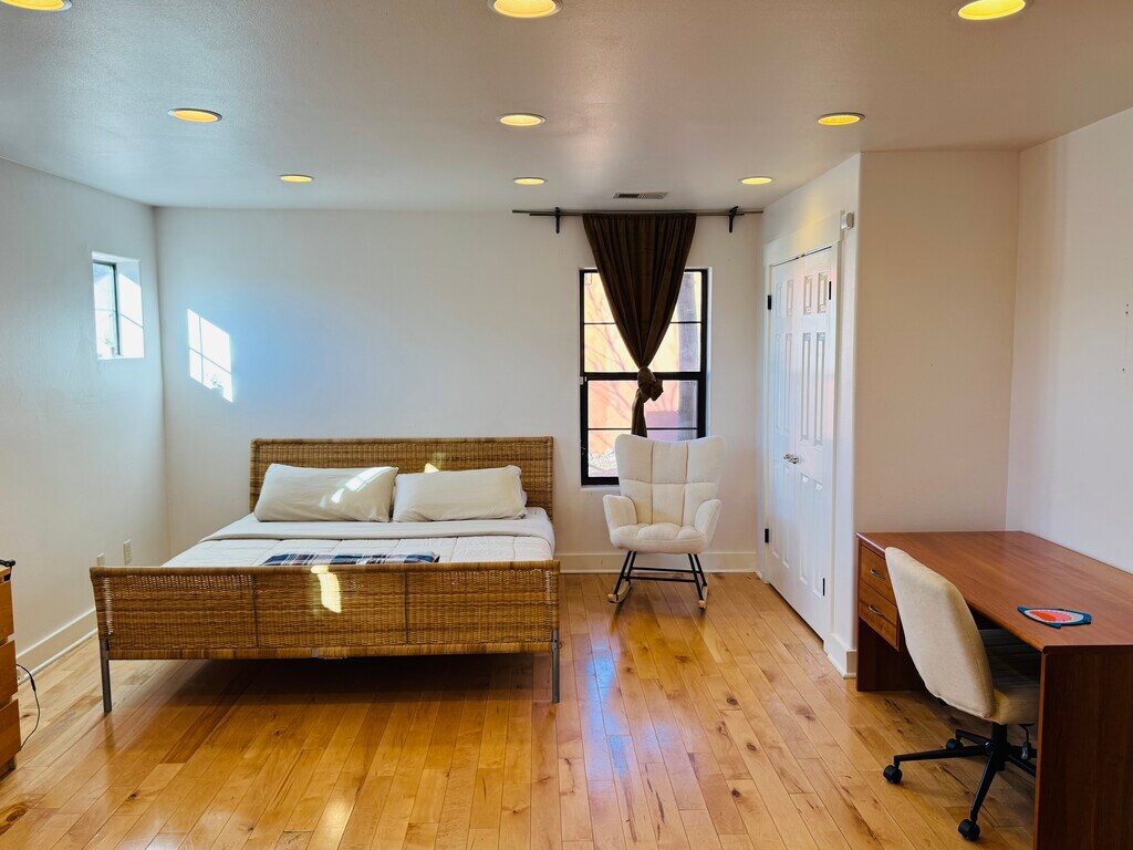 FULLY FURNISHED HOME. King Size beds, dressers, coffee table, sofa, TV's, fully equipped kitchen, towels, sheets and much more. Xfinity wifi and ADT security system included. Move-in ready just bring your clothes. Newer construction built in 2008. CONVENIENT LOCATION near Kirtland AFB, UNM, Fairgrounds, Sunport, Coronado Center. Lovely Open Concept, 9' Ceilings, light wood floors, Refrigerated AC, Kitchen Island, Fridge, Range, Microwave, Dishwasher, Washer, Dryer. 2 large rooms with double sinks and bathroom. Private yard for parking space, gated.