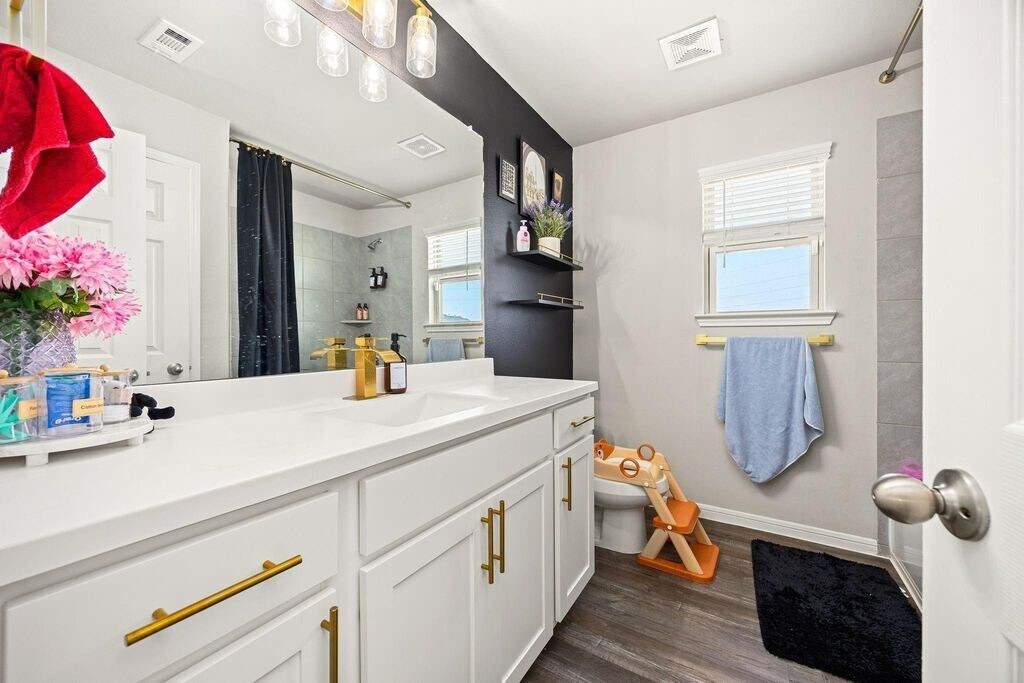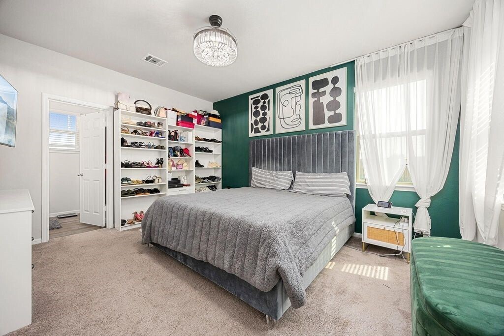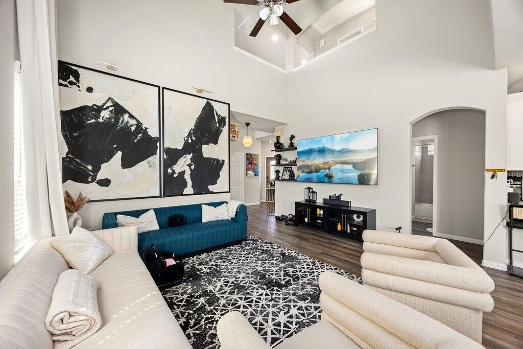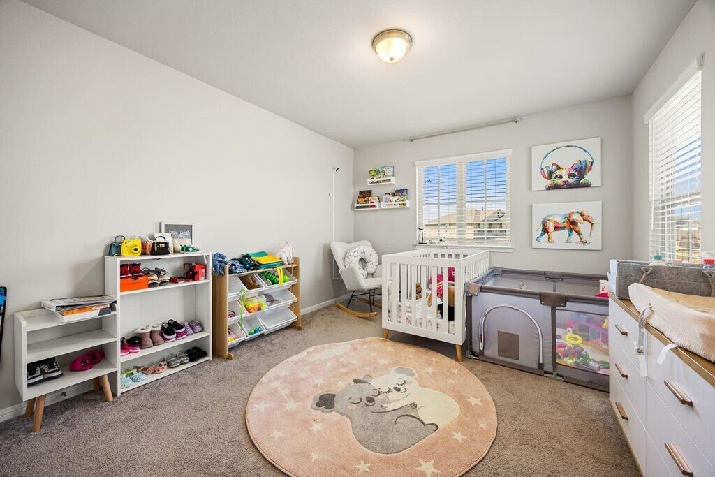 Step into your dream home located in the highly sought-after Sunterra neighborhood! This beautifully maintained 4-bedroom,3-bathroom residence offers a spacious 2,156 square feet of living space. The living room features soaring cathedral ceilings,creating a bright and open ambiance. An open-concept layout seamlessly connects the living area,dining space,and kitchen—perfect for hosting gatherings. The gourmet kitchen comes equipped with stainless steel appliances and a breakfast bar that comfortably seats three. The main-level primary suite includes a modern ensuite bath with a sleek shower and a generous walk-in closet. Also on the main floor is a second bedroom with a cozy closet and a conveniently located full bathroom. Upstairs,you'll find two more bedrooms,another full bath,and a versatile game room. MLS# 6628557