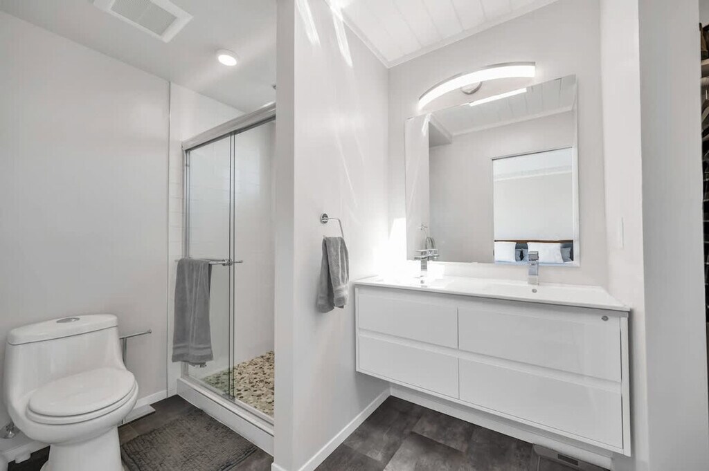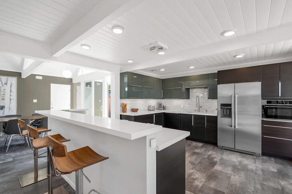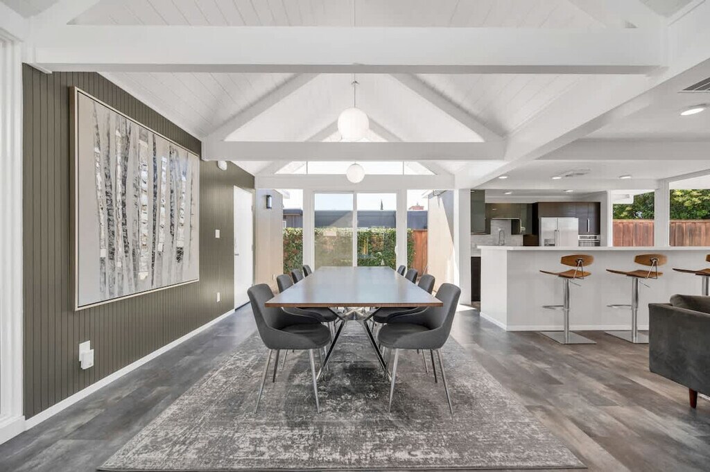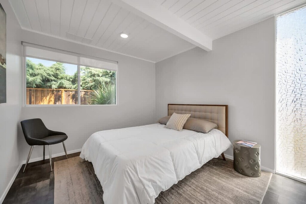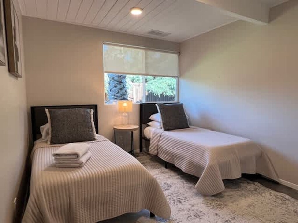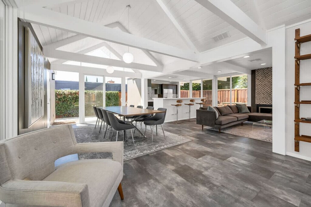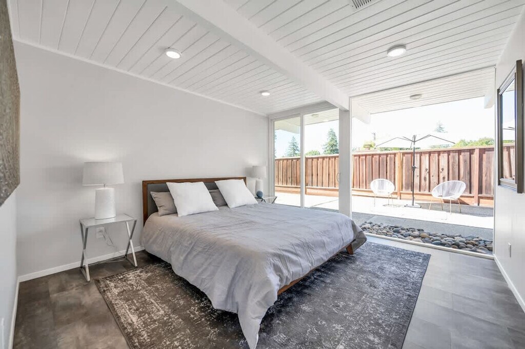 Beautifully renovated Mid Century Modern Eichler home with an open floor plan, ideal for entertaining or relaxing. Glass walls and skylights illuminate this architectural gem, offering an indoor/outdoor lifestyle in sunny California. Located 38 minutes from San Francisco, 40 minutes to Napa Valley, and 60 minutes to Muir Woods, with proximity to Northern California beaches. This stunning Eichler home in Concord, near the desirable Walnut Creek area, features three spacious bedrooms and two modern bathrooms, providing ample space for comfortable living. The open floor concept enhances the sense of space and light, with the living area opening to a beautifully landscaped backyard, perfect for outdoor activities. High-end finishes and attention to detail reflect its luxurious nature, offering a lifestyle of comfort and elegance. The open concept kitchen leads to the backyard and outdoor table, with multiple loungers and umbrellas for enjoying the California sun. An open-air atrium at the entrance provides a relaxing spot to listen to the palm trees sway. Ample parking is available in the driveway and on the street in front of the house. Situated in a private location on a quiet cul-de-sac in a mid-century modern neighborhood, the area boasts well-kept landscaped front yards. Free parking is available in the cul-de-sac and nearby streets. The BART train station is just two miles away, offering stops throughout the Bay Area. Walnut Creek, with its high-end restaurants and bars, is just two stops away or a 15-20 minute drive, depending on traffic. No parties or large gatherings are allowed, as this is a quiet residential neighborhood. Guests are asked to respect neighbors with quiet hours between 10pm and 7am. No shoes inside, and no smoking is permitted on the premises, with a $1000 fine for violations. The property shall not be used by more than the number of guests listed in the reservation, and no pets are allowed. A late check-out fee applies, and guests staying over 30 days must sign a separate lease. Utilities over $150 for stays of 30 days or more will incur additional charges. Energy conservation is encouraged, especially during peak hours from 4-9pm. Must be 21 or older to book, and no firearms or weapons are allowed. Enjoy your stay! [SI]