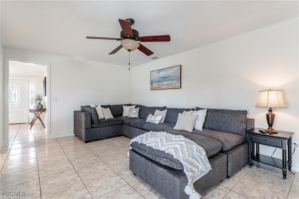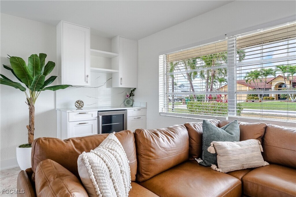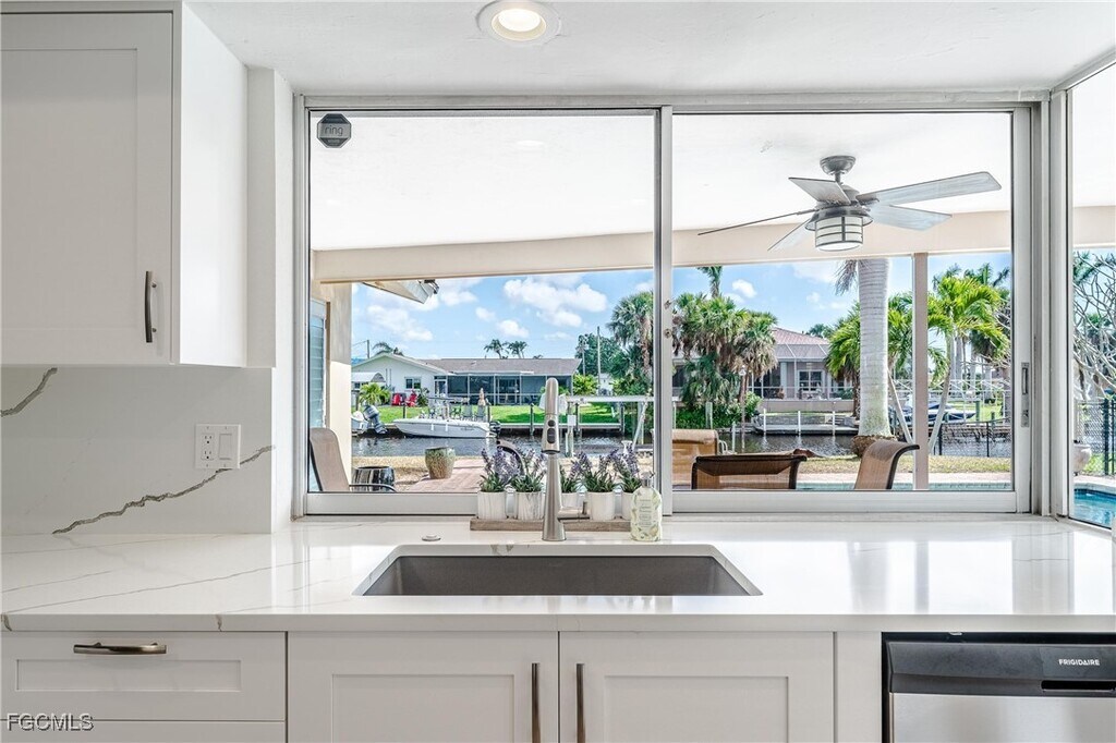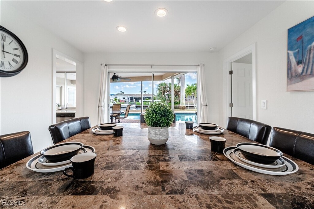 Exceptional direct sailboat access pool home in the highly desirable Yacht Club neighborhood. This waterfront residence offers ideal southeast exposure,filling the pool area with sunlight throughout the day and delivering peaceful sunrise views over the water. The home provides 1,664 sq. ft. of living space featuring 2 bedrooms,2 bathrooms,and a 2-car garage. The property is offered fully furnished and showcases an updated kitchen and modern flooring,making it truly move-in ready. Expansive windows and sliding doors allow for abundant natural light and uninterrupted water views. The living and dining areas are positioned along the waterfront,while the primary suite overlooks both the pool and canal. The primary bathroom includes dual vanities and a renovated walk-in shower. Outdoor living is a highlight,with a large screened paver pool deck,an open backyard,and additional dockside space ideal for relaxing or entertaining. The private dock features a boat lift,electric,and water,and provides fast,bridge-free access to open water. Ideally located near the Bimini Basin,the home is close to downtown Cape Coral,seasonal events,festivals,and Cape Coral Beach,just a short bike ride away. A rare opportunity to lease a waterfront pool home with premier boating access.
