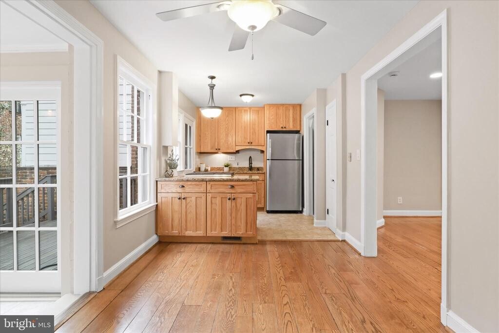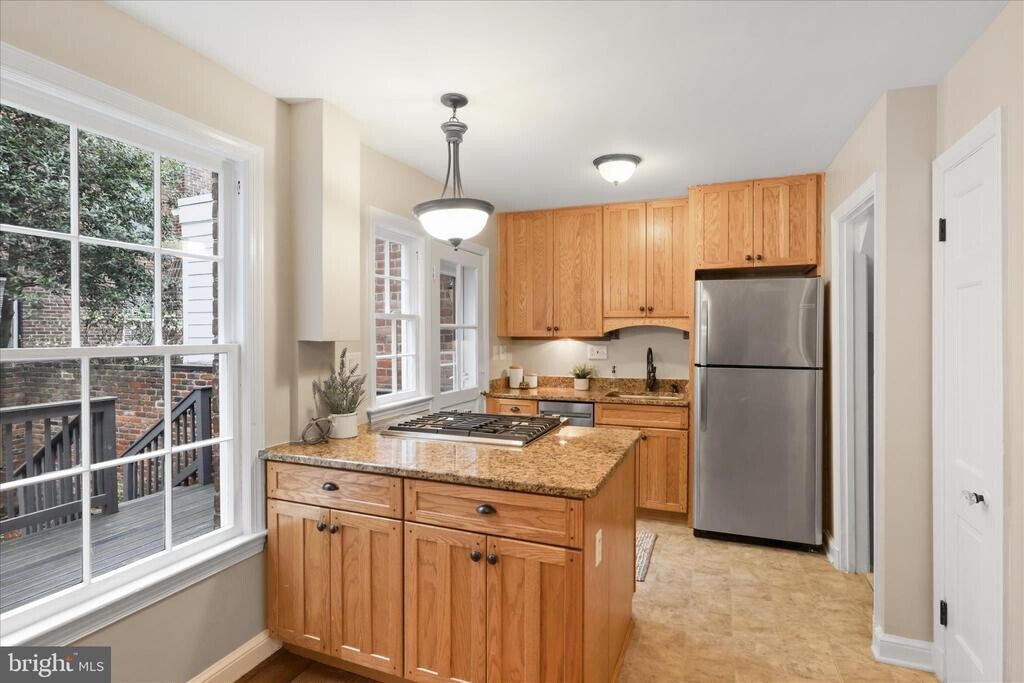 Tucked away on a quiet frontage road with excellent parking, this beautifully maintained townhouse offers the best of life in Old Town Alexandria just blocks from the waterfront, shops, restaurants, and everything that makes Old Town so special. With three finished levels, thoughtful updates, and an incredible backyard, this home combines timeless charm with modern convenience. The main level features a spacious living room with a cozy gas fireplace, bay window, and custom built-in bookcases. The open kitchen is appointed with granite countertops, a gas slide-in range, and stainless steel appliances, flowing easily into the dining area. Off the dining room, the versatile all-season room offers additional living space, den or office and features a large sliding glass door that opens to the composite deck and private backyard—perfect for relaxing or entertaining. Upstairs, you'll find comfortable bedroom space, while the finished lower level includes a large recreation room, full bath, utility room with washer and dryer, and abundant storage. Enjoy the quintessential Old Town lifestyle with easy access to the waterfront and all the modern amenities you want right at home.