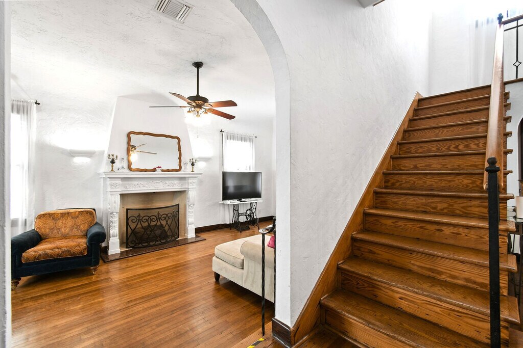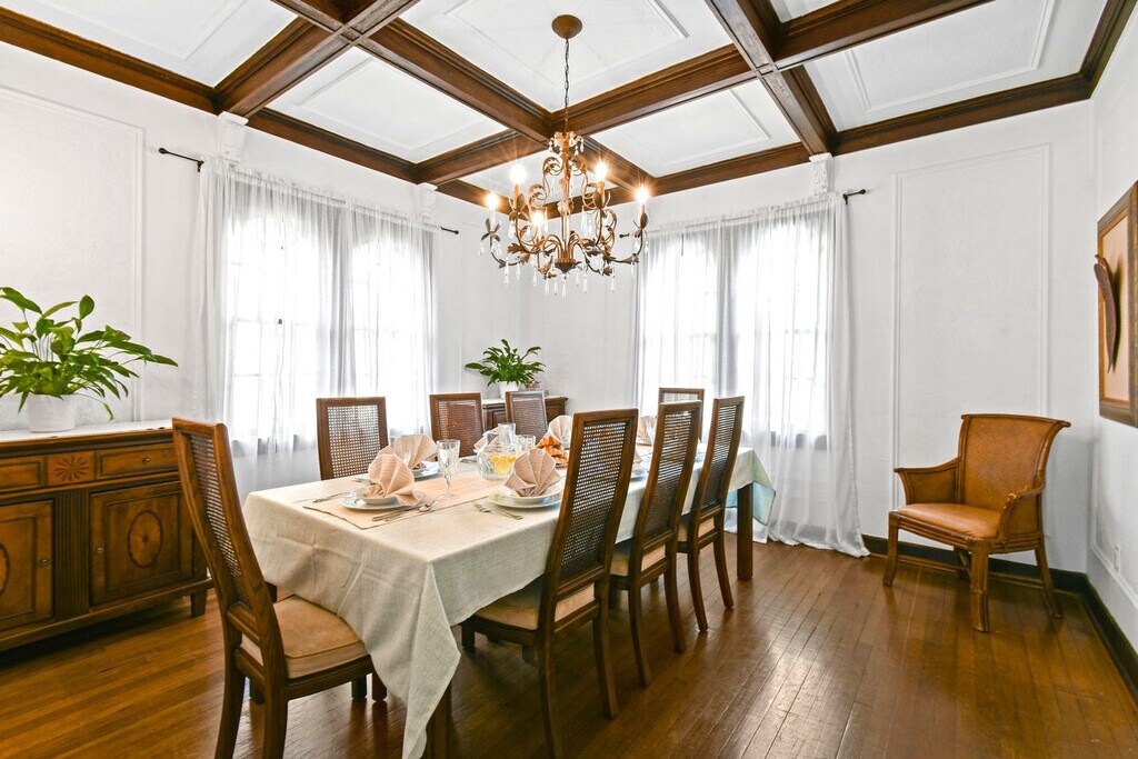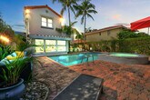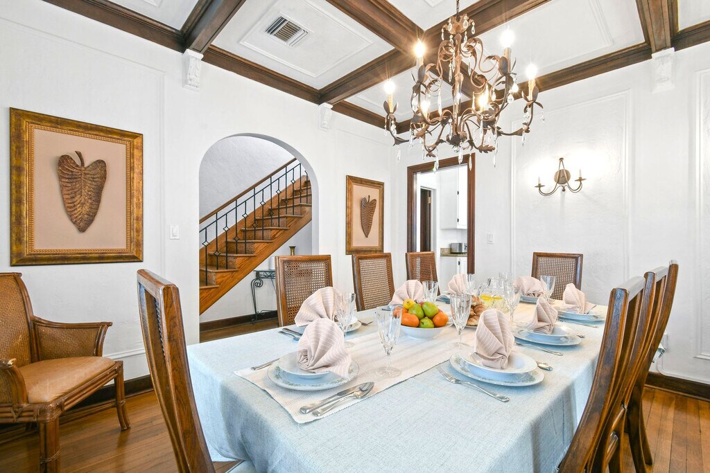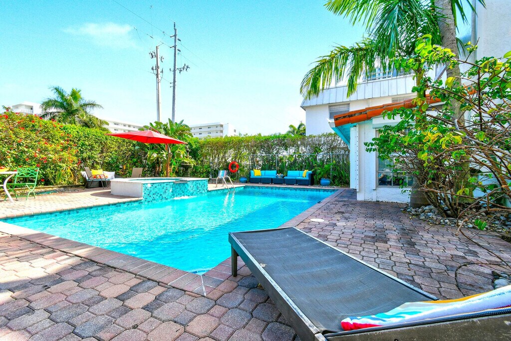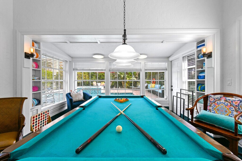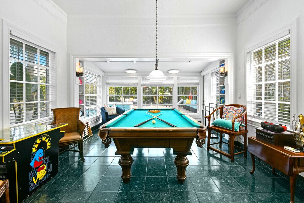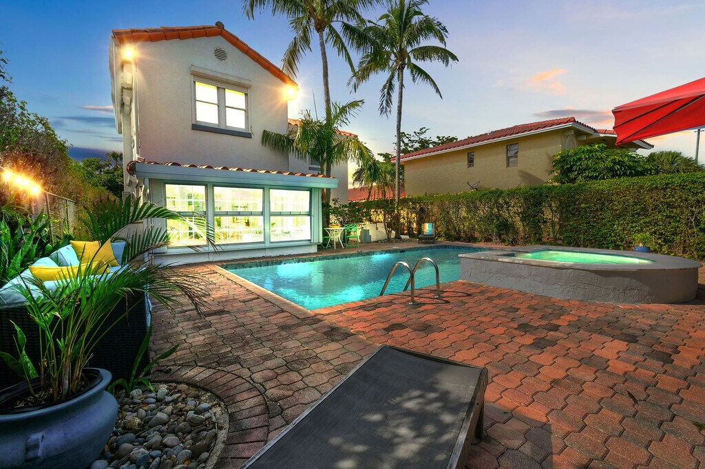 Feel at home in this casually elegant 4-bedroom, 2.5-bath, two-story pool home in West Palm Beach. This 1926 Mizner Style Mediterranean Revival home offers 2 levels and comfortably accommodates 8 guests, with all bedrooms located upstairs. This villa features a beautiful, fully private outdoor living space with nighttime lighting, a heated pool with a child safety alarm, pool chairs and lounges with umbrellas, an outdoor settee, chair, and cocktail table. There is a game room with a billiards table and an arcade machine. The complete kitchen is equipped with cookware, dinnerware, utensils, table linens, a microwave, a coffee pot and Keurig with coffee bar, refrigerators, dishwashers, and a stove/oven. For entertainment, there are books, puzzles, board games for all ages, and TVs in all bedrooms and living rooms. Wi-Fi is available throughout. Also provided are bed linens, bath towels, makeup towels, and beach towels. Central air-conditioning is available in the main house, and there is a washer/dryer in a separate laundry room next to the garage. Enjoy the use of kayaks with paddles and life vests, bicycles and helmets, and a beach umbrella. Private parking is available for multiple cars behind a code-gated entrance. Paloma is located on a tree-lined street within walking distance of Kelsey Park and Lake Park Marina. Close to beaches, parks, golf, and fine dining, this neighborhood offers numerous indoor and outdoor entertainment choices, casual and fine dining restaurants, and eclectic, upscale shopping. It is also located within minutes of Palm Beach International Airport, Tri-Rail, Brightline, fine dining, high-end shopping, museums, Florida wildlife preserves, and educational centers. Kelsey Park, with tennis and fitness stations on the intracoastal, is just one block away, as is Lake Park Marina, where you can charter fishing and scuba boats or launch your own boat. Absolutely no noise is allowed after 10 PM outside, parties or gatherings of any kind are not allowed at the house, and quiet hours start at 10 PM. Guests are responsible for cleaning the gas grill after each use and before check-out. If the grill is not cleaned to a satisfactory standard, a cleaning fee of $150 will be deducted. The same policy applies to the kitchen oven. Upon booking, a photo copy of the lead guest's driver's license which matches the credit card used to book is required, and the lead guest must be 27 years or older to book. Registration Number: 000025373, [SI]