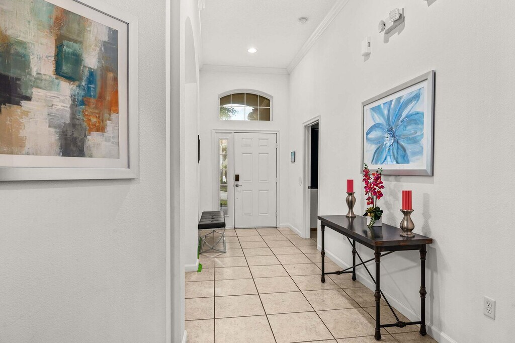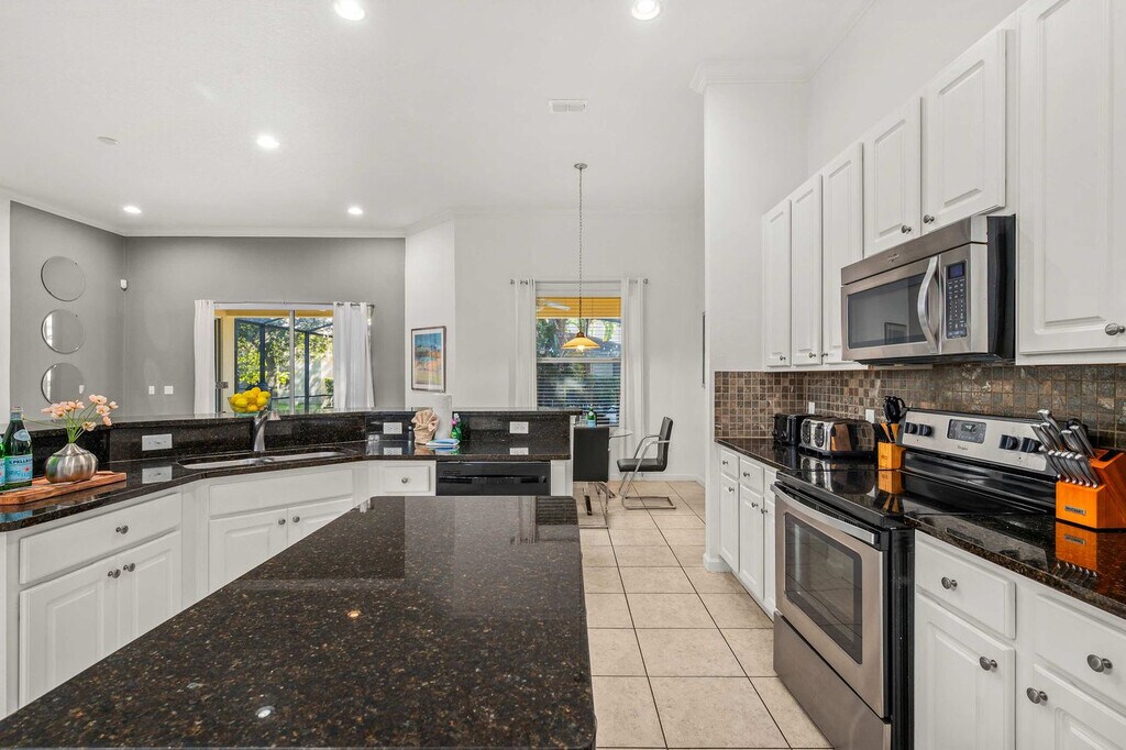 Searching for your dream vacation? Feel at home in this spacious 5-bedroom home with 4 bathrooms, located in the beautiful Solterra Resort. This home features a comfy living area, a free washer and dryer, a private pool with the option to add heat, a large full kitchen with stainless steel appliances, and spacious indoor and outdoor dining areas. The kitchen is fully stocked with everything you might need to make a big breakfast before an adventure-filled day in Orlando. Indulge in the luxury of a private pool in your own backyard while soaking up the Florida sun. This dazzling private pool is the ultimate backdrop for your TikTok and YouTube videos! Enjoy exclusive access to the community water park and amenity center/clubhouse. If you would like to add pool heating to your reservation, please let us know in advance, and we can coordinate to set that up for you. The cost for this amenity is $35 per day of stay, which will be invoiced separately. We kindly ask for at least a week's notice. During inclement (cold and/or rainy) weather we do not advise using the pool. Located in Davenport near theme parks, this vacation home is near many attractions. Disney Springs™ and Old Town are worth checking out if shopping is on your agenda, while those wishing to experience the area's popular attractions can visit Walt Disney World® Resort and Disney's Animal Kingdom® Theme Park. Disney's Hollywood Studios® and Epcot® are also must-see destinations. Spend some time exploring the area's activities, including outlet shopping, golfing, and winery tours. Kissimmee Station is a 22-minute drive and Kissimmee, FL (ISM-Kissimmee Gateway) is a 27-minute drive. Everything you need is at your fingertips so you never have to leave, but if you do, enjoy world-class meals with your family and friends at many nearby dining options just a couple of miles from the resort. Solterra Resort is in a great location just 5 minutes from a supermarket and other stores. There is also an IMAX movie theater and many other stores located at Posner Park, just 7 minutes away. Quiet hours are between 10:00 PM and 8:00 AM. There is absolutely no smoking and no drugs allowed inside the home or elsewhere (inside or outside) on the property. Failure to properly bag trash and dispose of it could result in fines up to $300. In the event you stay beyond the original scheduled check-out time of 10:00 AM, you may incur a fee of up to $300. We reserve the right to terminate a reservation without refund, and/or pursue monetary fines if guests are found to be in violation of any of these rules. [SI]