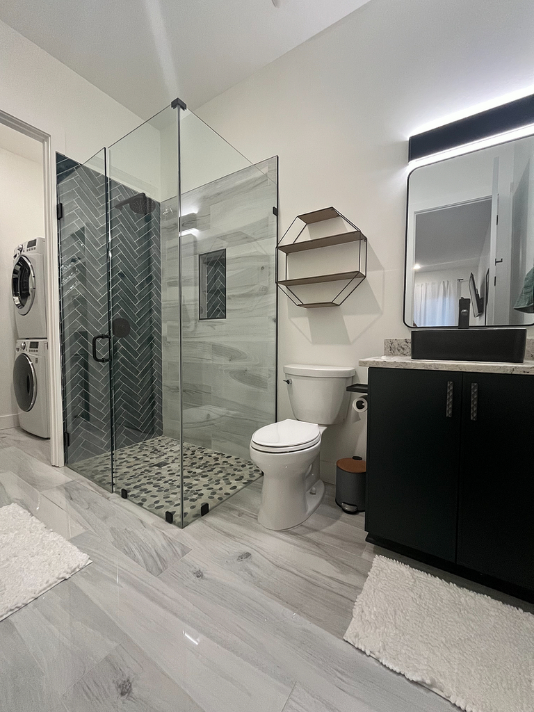Experience efficient and stylish living in this thoughtfully designed studio apartment, perfect for those seeking modern comfort in a prime location. The spacious living and sleeping area features a plush queen-sized bed, dresser, and a 65-inch smart TV, providing a cozy space for relaxation. A walk-in closet ensures ample storage, while the bathroom includes a sleek walk-in shower and the convenience of an in-unit washer and dryer. The open-concept kitchen boasts stainless steel appliances, granite countertops, and a bar with two stools, offering a functional dining space. Vinyl plank flooring and a private balcony add warmth and an outdoor retreat. Situated close to stores and restaurants, with both garage and driveway parking, this studio is ideal for those looking for convenience, style, and comfort. OPEN TO SHORT TERM LEASES