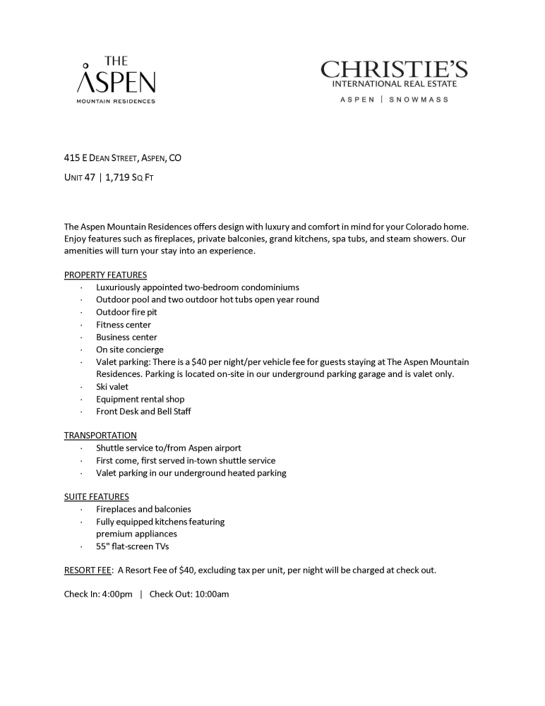 Enjoy Aspen's Spring skiing (3/22/26 to 3/29/26) from this luxurious 2 bedroom,2.5 bathroom condominium at The Aspen Mountain Residences located only steps to skiing,shopping,dining & more! One of the largest 2 bedroom units at the property with incredible SE facing views of Aspen Mountain including 2 decks,a private hottub & outdoor seating. The Aspen amenities include: outdoor pool open year round,2 hottubs (+private unit hottub,) gym,front desk,concierge,valet parking,ski valet,airport transfer,firepit,views,convenient downtown Aspen location & more! NOTE: THIS IS NOT A LONG TERM RENTAL. THE ONLY DATES AVAILABLE ARE 3/22/2026 to 3/29/2026. THE RATE LISTED IS THE NIGHTLY RATE. MLS ID 182589