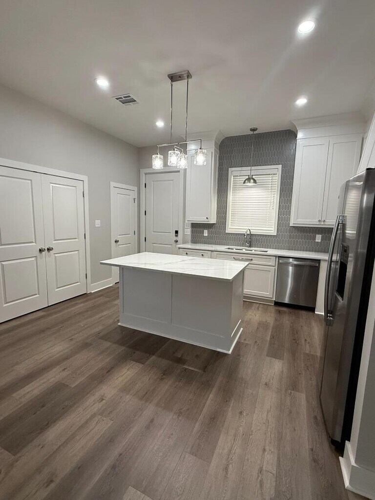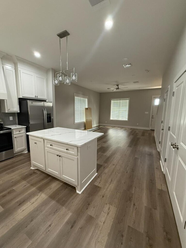 Beautiful new build minutes away from interstate access. Three bedroom, two and a half bath, two-story home with 2 car covered parking. Kitchen is equipped with stainless steel refrigerator, range and dishwasher, as well as a large, walk-in pantry. Custom built cabinetry boasts soft-close doors and drawers. Granite countertops and stainless sink. Washer and dryer included. Built in drawer units in every bedroom closet. Two closets in primary suite. Tub/shower combo in both upstairs bathrooms. Ceiling fans in living room and all bedrooms. Outdoor storage closet and patio. Walking distance from beautiful city park, which has paved walking paths, boat launch, kayak launch, water play pad for children, work-out equipment, amphitheater, rentable buildings and pavilions with grilling pits. Minutes away from shopping, banks, restaurants and grocery stores. Beautiful, brand new build minutes away from interstate access. Three bedroom, two and a half bath, two-story home with 2 car co...