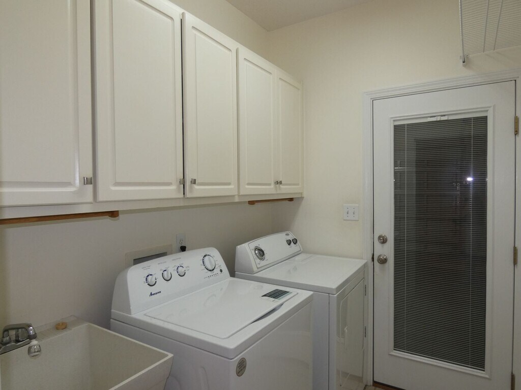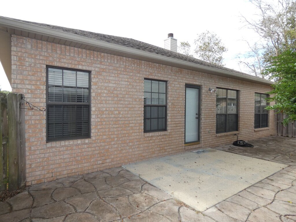 View In 3D: Welcome to this spacious, 3-bedroom, 2-bath home with over 1,850 square feet of comfortable living space. Ideally located near the Tiger Point Golf Club, this charming brick home greets you with a covered entry and a lovely shaded front yard with mature trees. Inside, you'll find luxury vinyl plank flooring throughout, complemented by an abundance of natural light. The living area features a cozy wood-burning fireplace and leads directly into the updated kitchen with beautiful dark wood cabinetry, granite countertops, a deep-basin undermount sink, and stainless steel appliances including a side-by-side refrigerator, a flat-top range/over, built-in microwave, and dishwasher. The spacious primary suite offers an ensuite bath with dual vanities, a garden tub, separate shower, and a spacious walk-in closet. The two additional bedrooms are generously sized, and share a second full bath with single vanity and tub/shower combo. Outside, enjoy a low-maintenance backyard with a patio space, ideal for outdoor gatherings with friends and family. The property also includes a 2-car garage and a dedicated laundry room with extra cabinet storage, a wash basin, and a full-size washer and dryer provided for added convenience.