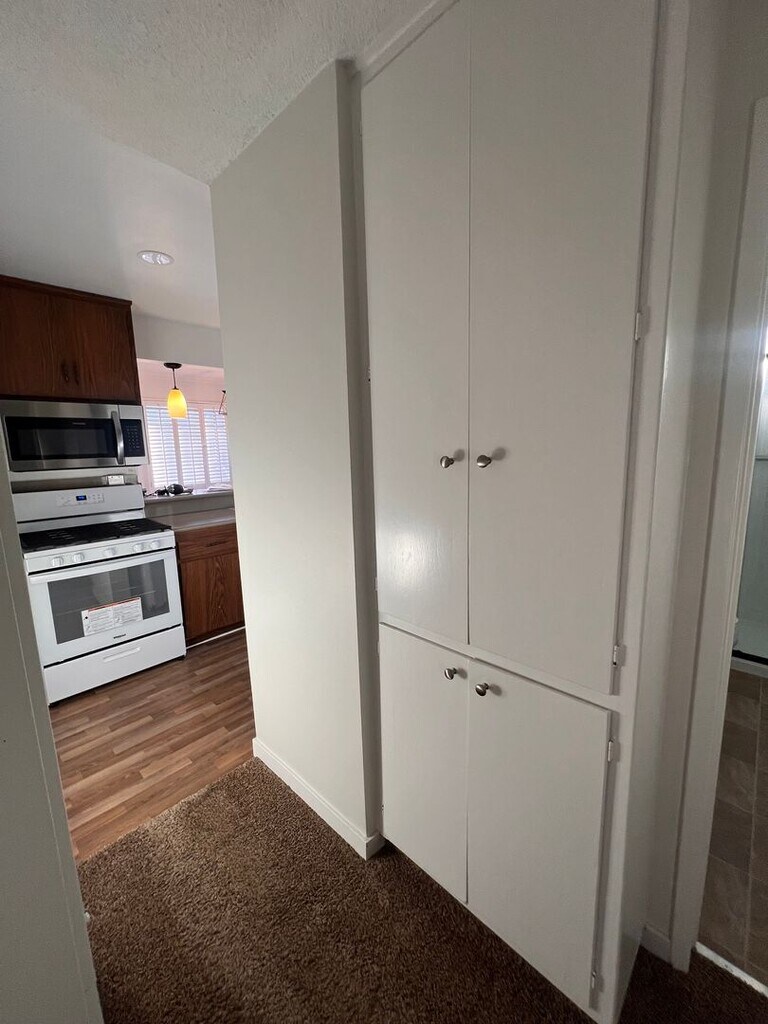 Tucked away at the rear of a charming two-home property, this inviting 3-bedroom, 2-bath residence offers a perfect blend of comfort, style, and privacy. Step inside to discover a spacious living room filled with natural light—an ideal setting for relaxing evenings or entertaining guests. The home features generous closet space throughout, providing both convenience and organization, while the updated bathrooms bring a fresh, modern touch to your daily routine. The galley-style kitchen is thoughtfully designed with functionality in mind, complete with a brand-new stove and oven, a full-size refrigerator, a convenient bar-top for casual dining, and an abundance of cabinetry for all your storage needs. Just off the kitchen, the quaint dining room adds character and charm, highlighted by a beautiful picture window, unique stained glass details, and stylish modern lighting—creating a warm and inviting atmosphere for meals and gatherings. Outside, enjoy your own private backyard retreat featuring a mature orange tree—perfect for morning coffee or unwinding at the end of the day. Additional amenities include a single-car garage equipped with a washer and dryer, as well as a private shared driveway. Ideally located near freeways and shopping, this home offers both tranquility and convenience in one delightful package.